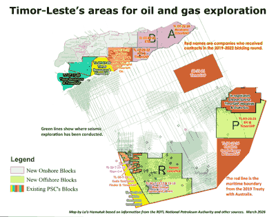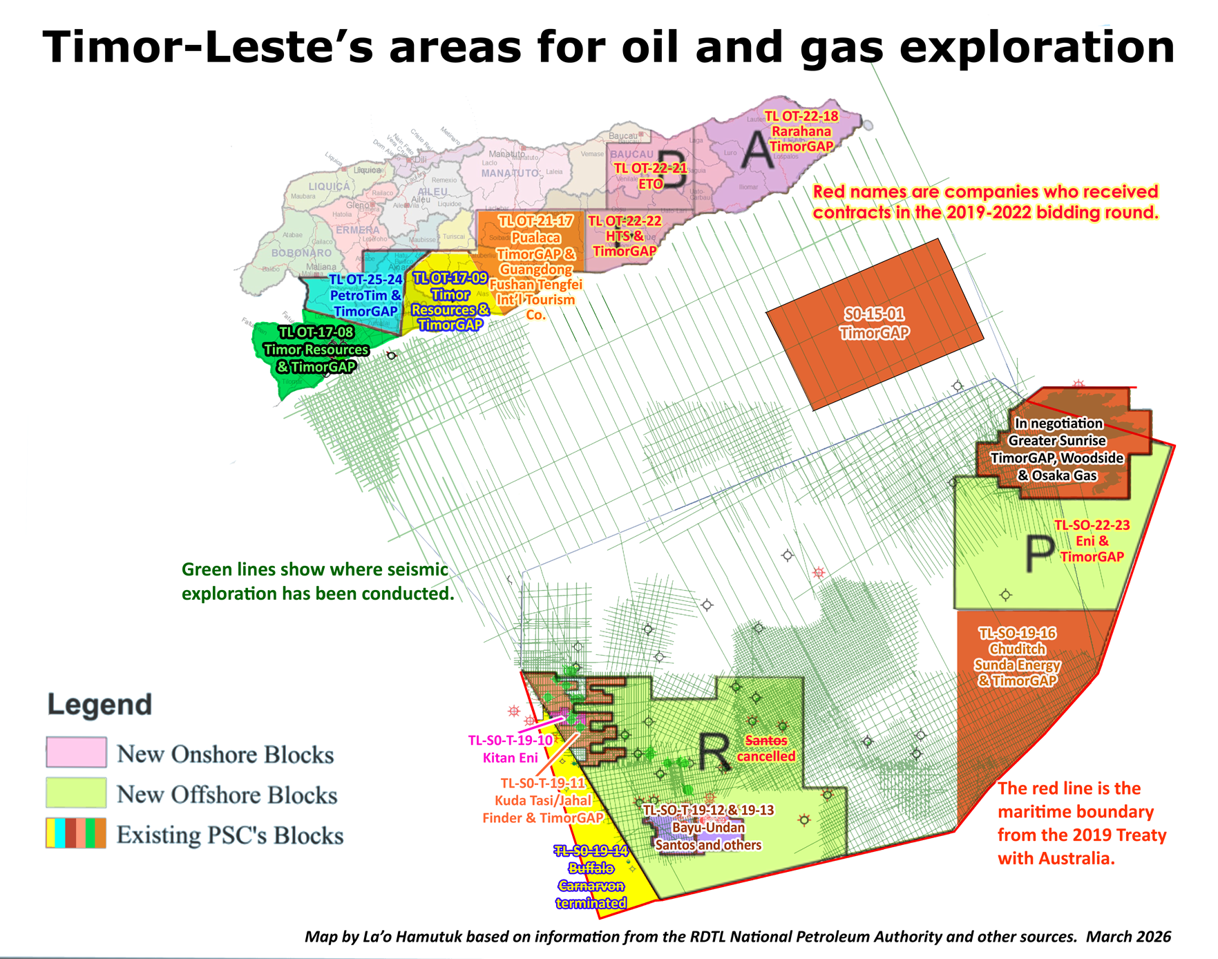 Contracted and relinquished areas over time The map above is from 2010. By the start of 2015, many of these contract areas had been completely or partially relinquished as unproductive, except for the areas shown below: By 2017, the Oilex and Minza contracts were terminated, and TimorGAP had received a new TLEA area and, with Timor Resources, two new onshore areas. Green lines show where offshore seismic exploration has been conducted: The Maritime Boundary Treaty came into effect in August 2019. Existing PSCs were adapted, and TimorGAP was awarded one new contract, as shown in the following maps: In 2022 and 2023, the first contracts were signed from the recently-completed bidding round (Block R was cancelled in 2025 after Santos withdrew.): |