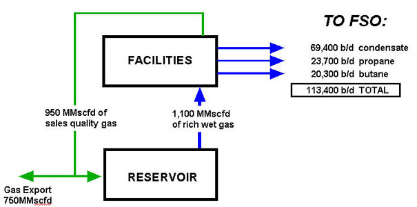 Condensate export will be achieved by tandem mooring/offloading to tankers up to Suezmax (150,000 DWT) size, through a floating hose connected to the tanker's port side manifold.