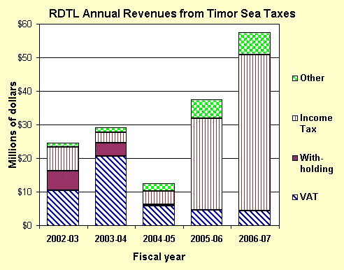 According to East Timor's 2003-04 budget, Timor Sea revenues from Elang-Kakatua and Bayu-Undan are as shown on the graphs at right. Only the tax revenues shown on the upper graph are used for each year's operating budget. This money includes: