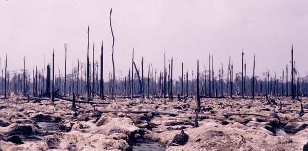 Non-government organizations who observe the oil and gas industry as well as the local community believe that the development of the oil and gas industry in Nigeria has really destroyed their environment. It is exacerbated by the explosions of the oil and gas pipelines and the heavy metals leaked into the rivers, sea and on land. There is no more fertile soil or productive forests, the farmers have difficulties working their wet and dry fields, even the fishermen have difficulties catching fish, and the mangrove forests which are the breeding place for certain species of fish are nearly extinct. In the eyes of Ken Saro Wiwa, the environmental degradation of the land amounted to direct environmental genocide on a wide and systematic scale.