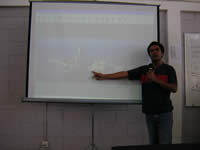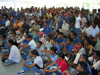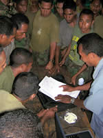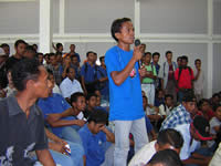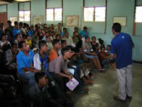 Briefing for engineering students at Universidade Nasional Timor-Leste, Hera campus, January 2004. UNTL mechanical engineering lecturer Constancio Antonio Pinto, who is also working at Bayu-Undan, tells students how the platforms operate.