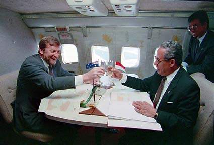 | |  | Figure 27. Foreign ministers Gareth Evans and Ali Alatas toast the signing of the Timor Gap Treaty while flying over the Timor Sea. |