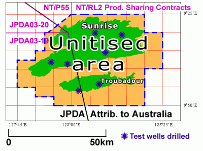 |  | Figure 28. Sunrise Unit Area defined by the IUA (tan, with dashed blue border), showing fields (green), production-sharing contracts (purple) and test wells (blue). The black line divides the Joint Petroleum Development Area (left) from the area attributed to Australia. |