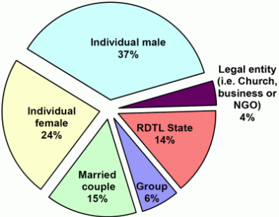 Ita Nia Rai's most visible activity has been registering land claims. This process allows individuals, groups (including married couples), organizations and the State to claim land within the project areas that they feel they have a right to. A person who wants to make a claim can provide documents or witness statements to prove their entitlement. INR then collates and displays a map of local land claims. People are free to make and challenge claims until the end of the display period, which is 30 working days. If there are multiple claims to the same land, disputants can take part in up to three mediation sessions, or go to court. After the display period, no new claims can be registered for that area. However, people can update existing claim details, e.g. if land is sold or passed to others. In 2008 INR began pilot programs in Manatuto and Liquiçá. It has since registered claims in Baucau, Aileu, Bobonaro, Oecusse and Dili. INR plans to register 50,000 private land claims in district capitals by 2012. The graph at right does not represent the reality of land claims so far. It shows the number of claims, the number of land parcels claimed is fewer (as more than one person or group may claim the same land). The project has encouraged married couples to register joint claims, as a key strategy of promoting women's land rights. In Manatuto, culturally women are more likely to be landowners, and as Manatuto and Liquiçá have registered many more claims (as they were pilot projects) this also distorts figures. As the project extends from town centers, a higher percentage of individual male claims are registered, and land parcels increase in size. These parcels will increase in value as towns expand. Most of the "legal entity" claims in this graph are from the Catholic and other churches. INR's public information process is more extensive than many other donor and government projects. It also records and presents information through maps, photos and oral statements. This makes it easier for people who have difficulty reading to participate, and others can learn from this model. The community also has a key role in making and verifying claims. Its major flaw is its evaluation process. So far this has been weak and not systematic. It has not yet sufficiently harnessed community expertise in improving and strengthening the project. INR extended the claims process beyond the pilot areas even before community surveys of pilot projects began. Community and Rural Land Many of Timor-Leste's high profile land conflicts are outside urban areas, and rural land hosts various private sector, state and community developments. Despite this, few land initiatives focus on rural needs. World Bank and Australian National University researchers estimate that over 90% of Timor-Leste's land is community land or customary land. Decisions about community land are complex and must balance the need for safeguards for community land holders, (e.g. protections by the State), with strong community land rights (protection from the State). During the Indonesian occupation large areas of community land were taken and reclassified State land, with the intention of giving this land for private company use. The INR project will influence community land in two key ways: through its support for the transitional Land Law and through its land claim registration process. The INR project plans to register land in district capitals (towns and areas near towns), which are less strongly governed by community and customary land systems. The benefit of this is that it does not apply inappropriate ownership structures to community land. While this acknowledgment of the difference between community/customary land needs and other land rights is important, it is only a first step. (The Civil Code drafted by the Ministry of Justice does not acknowledge community land at all). However, we need a much deeper public discussion about how community/customary land interacts with the formal land system. In the absence of this discussion, community/customary land rights are overlooked or decided by a small number of policy-makers. This leaves no room for community and customary landholders to contemplate and contribute meaningfully to policies and processes that fundamentally affect their future. We cannot, and should not, expect to resolve questions about community and customary land immediately. However, we do need clear plans for a process to engage meaningfully with community and customary landowners and to initiate extensive and deep community discussions. The Future? Land policies will have long-lasting consequences, and impact on food security, economic development, the environment, women's rights and many other sectors (see Land as a System). However, there is little cooperation between the Ministry of Justice and other government departments to plan and coordinate activities and obtain input into land processes. If the Council of Ministers passes the draft Land Law it could reach Parliament in the first half of 2010. Yet there is little planning or preparation for implementing this far-reaching law. Activities that are needed include land rights education, intra-governmental planning processes, training in land-related sectors, monitoring processes, increased legal or para-legal support, and support for evictees -- especially those who rely on land for daily needs. Civil society analysis and advocacy on land issues is also weak and under-developed. Many NGOs, community groups, not-for-profit enterprises and justice advocates do not yet realize how land processes will affect their activities. These groups need to consider what they can do to support people to understand and assert their land rights. In other countries support for land rights includes bringing land cases to court, protecting land-based livelihoods, fighting unfair evictions and influencing draft legislation. It is also important to help people avoid debt that forces them t