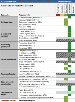 On 11 January, the EITI Board issued a decision on the validation, agreeing that "Timor-Leste has made meaningful progress overall in implementing the 2016 EITI Standard." The EITI Board slightly revised the scorecard from SDSG's draft, agreeing on the new one at right. Timor-Leste was told to take "corrective actions", with a second validation to begin on 11 January 2018. They include (abridged):