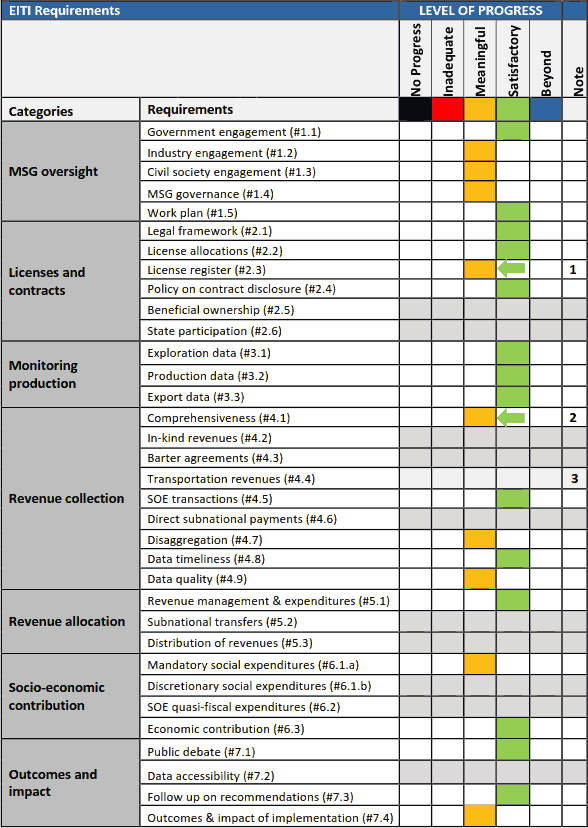 However, SDSG found that most of these problems resulted not from "a lack of data but rather strained relations among stakeholder groups, lack of trust, and lack of capacity. Implementation of EITI recently may even be said to be driven more by the desire to ‘check the boxes’ and avoid suspension rather than reflectively pursuing the overall objectives of disclosure and transparency." SDSG agreed with the EITI Secretariat that Timor-Leste's "progress has been meaningful (less than compliant, see box below) with respect to industry engagement, civil society engagement, MSG governance, level of disaggregation, data quality and assurance, social expenditures, and outcomes and impacts. In addition, we find that progress is likewise meaningful with respect to the work plan, register of licenses, production data, export data, and comprehensive disclosure of taxes and revenues." After the report was circulated, the Multi-Stakeholder Working Group wrote comments as did others. The report and comments were submitted to the international EITI Board. The EITI Secretariat maintains a web page on Timor-Leste's 2016 validation, with more links and documents. | |||