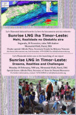 Sunrise LNG in Timor-Leste: Dreams, Realities and Challenges A Report by La’o Hamutuk On 18 February, 2008, La'o Hamutuk held a Book Launch for our report on Sunrise LNG at Memorial Hall in Dili. In spite of the State of Emergency following the attempted assassinations of the President and Prime Minister one week before, more than 115 people came, filling the room to capacity. Attendees included 23 from Timorese NGOs, 18 from international NGOs, 14 from the petroleum sector of the government, 17 from other government departments, 13 journalists, 10 foreign diplomats, six from international institutions and three from oil companies. Click on the small invitation at right to see it larger. Copies of the report were distributed free on paper and CD-ROM to those who attended the launch; additional books are available from La'o Hamutuk for $20 and CDs for $10. Secretary of State for Natural Resources Alfredo Pires was the guest speaker, and gave this PowerPoint presentation. Following the Secretary's presentation, Santina Soares and Viriato Seac presented a one-hour PowerPoint summary of the report in Tetum and English. Photo: Viriato Seac, Santina Soares and Alfredo Pires respond to questions and comments from the audience. La'o Hamutuk staff are ready to present this report to any audience in Tetum, English or Bahasa Indonesia. Contact our office to arrange specifics. |