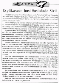KARTA Esplikasaun husi Sosiedade Sivil Publika ona iha Timor Post loron 24-25 fulan Fevereiru 2009 Iha editorial Jornal Timor Post edisaun sesta Feira, loron 20 fulan Fevereiru 2009 nian koalia kona ba “Projeitu Oleu Pezadu sei Implementa?” nebe hateten katak iha pro-kontra ba implementasaun fabrika neé. No idea kontra projeitu neé mai husi partidu opozisaun Fretilin. Maibe iha projeitu ida neé laos deit ema husi Fretilin deit maka tau preokupasaun ba ida neé maibe mos husi sosiedade sivil nebe iha papel importante duni atu sai kontrolu sosial no transformador sosial iha komunidade nia laran, atu garante dezenvolvimentu nebe sustentavel no benefisia ba interese povo nian. Agora daudaun nudar membru sosiedade sivil nian, La’o Hamutuk hamutuk ho ONG balun monitoriza no analiza hela planu fabrika eletrisidade nebe uza Oleu Pezado iha Timor-Leste, La’o Hamutuk halo analiza hela ba impaktu nebe bele mosu husi fabrika ida neé ba meu-ambiente no saude ba povo Timor-Leste. No preokupasaun ida neé atu hateten katak presiza iha transparansia ba dezenvolvimentu nebe sustentavel. Ita hotu hanoin katak eletrisidade hanesan buat ida nebe importante duni ba komunidade sira iha Timor-Leste,ami mos hanoin katak presiza iha duni analiza impaktu ambiental molok halao pojeitu nebe klean liu atu bele identifika sa impaktu nebe mosu wainhira fabrika ida neé harií. Sosiedade sivil hanesan La’o Hamutuk laos Organizasaun ida nebe sai opozisaun ba Governu Timor-Leste, maibe La’o Hamutuk tau nia pozisaun nudar parseiru nebe importante ba Estadu no povo. Hodi ida née nudar parte ida husi sosiedade sivil nian, La’o Hamutuk hakarak informa ba publiku katak servisu La’o Hamutuk kona ba fabrika oleu pezadu nian laos parte ida ka kanal interese politiku husi grupo, partidu ka individual ruma nian. Sosiedade sivil iha hanoin ida deit atu suporta Estado hodi garatia benefisiu ba povo tomak nian, no interese katak iha desizaun nebe matenek ba nasaun tomak bazeia husi faktus nebe iha laos opiniaun deit. Atu hatene liu tan kona ba servisu sosiedade sivil nian liu-liu La’o Hamutuk nian, bele mai visita ami nia ofisiu iha Farol, Yayasan Hak nia kotuk ka liga ba ami nia website : www.laohamutuk.org ka bele hatoó hanoin ruma liu husi E-mail info@laohamutuk.org ka no. telephone + 670 3325013. Mak neé deit informasaun neé ami hatoó no ba konsiderasaun husi ita-boot sira ami hatoó obrigado wain. | LETTER Explanation from Civil Society Letter to the Editor, published (in Tetum) in Timor Post 24-25 February 2009 The Timor Post daily newspaper editorial on Friday February 20, 2009, about “Will the Heavy Oil Project be Implemented?” stated the arguments for and against this power plant implementation. And ideas against this project come from the opposition party Fretilin. But not only people from Fretilin are concerned about this project, but also people from civil society which has an important role to provide balance and transformation within the community, to ensure development which is sustainable and benefits the people’s interests. Today, as a member of civil society, La’o Hamutuk, together with other NGOs, is monitoring and analyzing the plan to generate electricity using Heavy Oil in Timor-Leste. La’o Hamutuk is analyzing the impacts which could occur from this facility on the environment and health of Timor-Leste’s people. We are concerned that this requires transparency for sustainable development. Everyone knows that electricity as very important for Timor-Leste communities. We also think that an in-depth environmental impact analysis should be done before the plant is built, which can identify what is the impacts will be when this power plant is operating. Civil society like La’o Hamutuk are not organizations in opposition to the Timor-Leste Government; La’o Hamutuk takes positions as an important partner for the State and the people. Therefore, as a part of civil society, La’o Hamutuk would like to inform the public that La’o Hamutuk’s activities related to the heavy oil power plant project are not to support or provide a channel for any group, political party, or individual interest. Civil society wants only to support the State to provide benefits all our people, and would like that decisions are made wisely for the whole nation, based on facts and not only opinions. To know more about civil society’s work, especially La’o Hamutuk’s, please visit our office in Farol (behind Yayasan Hak) or go to our website www.laohamutuk.org or send us some ideas by email to info@laohamutuk.org or telephone +670-3325013. We thank you for your consideration of this information. |