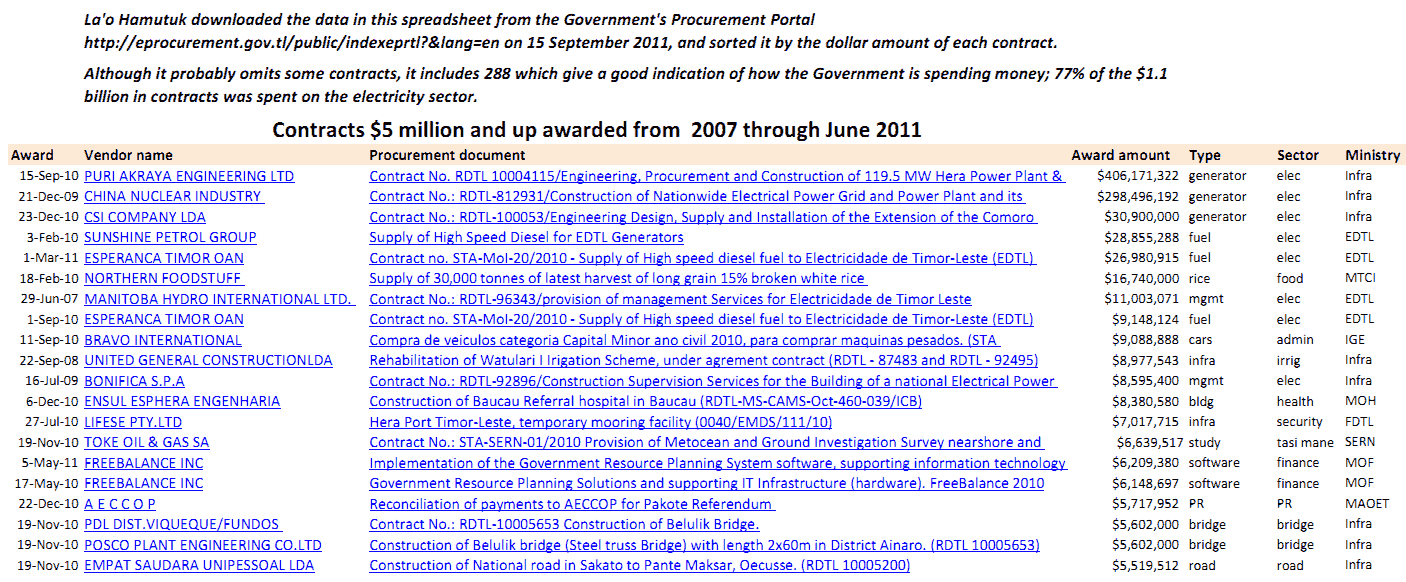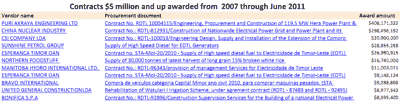 The Deloitte audit report and the Procurement Portal (see blog and spreadsheet on contract awards) became accessible in 2011 and provide additional information about PAE and its $406 million contract, the largest in Timor-Leste's history. The Portal shows that six of the seven largest Government contracts over the last three years have been for the electricity sector (click on graphic at right). | Iha fin de Outubru, CNI22 fo servisu ba Xineza nain 435 no Timor-oan nanin 397 ba projeitu ne’e, no relatoriu EB nian inklui titulu ba servisu nian. Iha ne’eba laiha mudansa signifikante ba lalaok ambiental ne’ebe fraku iha fulan ne’eba. Tuir ELC/Bonifica nia relatoriu iha Novembru 2010, liu ema nain 156 husi trabalhadores Xineza sira (barak liu mak “trabalhador ho skil” ba linha transmisaun) to ona iha Timor-Leste (total ema nain 591), maibe numeru Timor-oan ne’ebe servisu iha linha transmisaun nian redus ema 44, no iha Novembru nia rohan CNI22 fo servisu deit ba trabalhadores Timor-oan 353. Iha Relatoriu Novembru inklui mudansa ba sesaun reklamasaun ambiental, ne’ebe hatudu hadiak oituan, maibe, ba primeira vez, fo relatoriu kona-ba saneamentu ne’ebe fraku no kondisaun hela fatin ba trabalhadores sira ne’ebe hari substasaun sira iha Timor laran tomak. Relatoriu Janeiru 2011 hatudu nafatin trablhadores Xineza 591 maibe Trabalhadores Timor-oan menus tan, ba ema nain 331. Laiha servisu ne’ebe halo iha sentral eletrika Hera no Betano durante Novembru. Tore 18 foun hari ona ba linha transmisaun, iha mudansa kiik liu duke fulan kotuk, no trabalhadores sira hahu dada fiu husi parte Hera- Dili nian, iha servisu konstruksaun balun halao ona oha substasaun Dili no Manatutu, ho preparasaun fatin inisial iha fatin balun. Negosiasaun ho subkontrator Indonezia seluk ba parte linha nian sei nafatin iha prosesu laran, no kontratu seidauk asina. Semana ne’en hafoin asina kontratu ho Puri Akraya Engineering (PAE), Kompania Indonezia nafatin hein atu hetan pagamentu inisial antes, no seidauk hahu halao servisu, maske nia organiza ona “Enkontru Kick-off”. Relatoriu ELC/Bonifica ba fulan Novembru nian hateten katak PAE sei fo “prioridade masimu” ba sentral eletrika Hera, “ho tarjeitu ba jerador tolu sei bele halao operasaun iha Novembru 2011 no jerador hat seluk sei halao operasaun iha Marsu 2010.” Servisu iha Sentral eletrika Betano” sei komensa durante 2011, tarjeitu atu kompleta instalasaun ba jerador hat ne'e sei iha entre 2012 nia rohan no mediu primeiru 2013.” Maske nune’e, PAE nia orariu projeitu (klik iha imazem iha liman karuk) hatudu katak fulan tolu ba “testes no komisionamentu” sei la hahu to fulan 16 hafoin projeitu ne’e komesa — ne’e katak to Abril 2012 — orariu ida ne’e tenke aseleira bainhira atu hetan tarjeitu. This table lists the largest contracts awarded between 2008 and 2010. More than 77% of over a billion dollars in contract awards was spent on the electricity sector; PAE and CNI22 are the two largest contracts. Click on the graphic to see it larger.