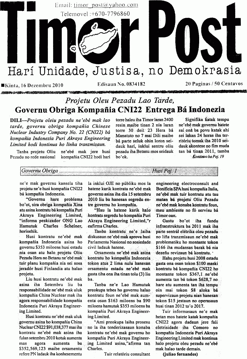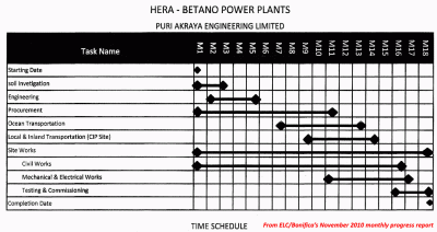 Project redesigned On 4 November 2009, the Prime Minister wrote a letter to Parliament (Portuguese original) explaining problems with the project and indicating that a major redesign is in process. The new version will use new generators (rather than second-hand ones) which can be adapted to use diesel or gas instead of heavy oil. It will have more generating capacity and longer, closed-loop, transmission lines. | Alterasaun ba projeitu Iha loron 4 Novembru 2009, Primeiru Ministru haruka ona karta ba Parlamentu Nasional (Port.) (mos Ingles) hodi esplika problema sira ho projeitu oleu pezadu nian, no indika katak alterasaun boot iha prosesu laran. Desenho foun ne’e sei uza jerador foun (laos makina tuan), no bele uza kombustivel seluk, no sei aumenta kapasidade atu produz electrisidade, no hanaruk linha transmisaun nian. | Cornerstone laid On 15 January 2010, the Prime Minister, President of the Republic, Minister of Infrastructure and President of Parliament, together with a few ambassadors, laid the cornerstone for the Hera generating project, attended by more than 100 Government officials and a few others, although nobody from civil society or the political opposition was invited. Click here for photos, transcripts, translations and audio recordings of the event and the often defensive speeches. The President's office issued a press release celebrating the ceremony, which was responded to by Fretilin and Luta Hamutuk. | Lansamento hatidin fatuk dahuluk Iha loron 15 fulan Janeiru 2010, Primeiru Ministru, Presidente Republika, Ministru Infrastrutura no Presidente Parlamento, hamutuk ho Ambasador balun, halao lansamento hatidin fatuk dahuluk ba projeitu eletrika Hera, partisipa husi ema liu 100 husi ofisiais Governu nian, no sira seluk balun, maske besik laiha ema ida husi sosiedade sivil, ajensia internasional ka politikus opozisaun hetan konvite. Click iha ne'e atu hare no rona foto, tekstu diskursu sira, no gravasaun husi ceremonia ida neé. Komunikadu impresa (Ingles) husi gabinete Presidente Republika nian ba selebrasaun seremonia ne’e, hetan responde husi Fretilin (Ingles) no Luta Hamutuk. | 2010 Budget Rectification In June and July 2010, Parliament enacted the Government's budget rectification, with increased expenditures in many sectors. The rectification added $10 million to the $50 million appropriated for this project for the year. La'o Hamutuk's submission explained that it will cost much more. According to the September 2010 Budget Execution Report, $33 million of the allocated $60 million was spent during the first nine months of 2010. | Orsamentu Rektifikativu 2010 Iha fulan Junu 2010, Governo proposta Orsamentu Rektifikativu ba Parlamentu. Orsamentu foun aumenta alokasaun ba projeitu ida ne'e ho tokon $10 liu tokon $50 aprova ona ba tinan 2010. Submisaun La'o Hamutuk nian esplika katak projeitu ne’e nia kustu sei boot liu ida ne’e. Bazeia ba Relatoriu Ezekusaun Orsamentu 2010 iha fulan Setembru, tokon $33 husi osan tokon $60 ne’ebe aloka ba projeitu ne’e gasta ona durante fulan sia primeiru iha tinan 2010. | September 2010: Project way behind, CNI22 loses power plant contract This section of this web page is also available as a blog entry. From the beginning, this project has been characterized by bad planning, dubious procurement procedures, incompetent contractors, illegal practices, poor oversight, and lack of transparency and accountability. La’o Hamutuk has written about this many times, and we are sad to report that reality is even worse than we had feared. La'o Hamutuk has obtained the confidential, 133-page, September 2010 Monthly Progress Report from the Italian joint venture "Electroconsult and Bonifica, SpA” (EB) which the Government hired in July 2009 to supervise Chinese Nuclear Industry Company No. 22 (CNI22). The Government had contracted CNI22 six months earlier, and they were implementing the project without any clear specifications, valid tender, environmental impact analysis or public consultation. In response to criticism that the government was not managing the project effectively, Timor-Leste is paying EB $2 million per year as a consultant to oversee the project. EB's September 2010 report describes an escalating disaster in performance, implementation, environment and safety, revealing that the Government has already re-assigned responsibility for the power stations to another company, nearly doubling the cost of the entire project. The project is way behind schedule, and EB is very frustrated with the slowness and unresponsiveness of CNI22. EB says it “does not spare any effort” to press the Chinese company to speed up progress which they say is “below the satisfactory level required” to meet the 31 December 2011 completion date. The power plants have been removed from CNI22’s responsibility, at great expense. During September, the only work done on the Hera generating station was applying asphalt on the area where oil tanks will be place. Virtually nothing has been done at Betano, although the project timeline says work was to have begun in June 2010. The Government decided to “cancel" the Hera and Betano power plants "from CNI22’s contract.” Construction of these generating stations was re-contracted to “the Indonesian company Puri Akraya Engineering Limited” on 15 September 2010. La’o Hamutuk’s internet research on “Puri Akraya” turned up only that the name was newly registered with the Hong Kong Companies Registry on 4 August 2010. Five weeks later, Timor-Leste awarded them this huge contract to “do the supply, installation, commissioning and operation of 15 Generating Sets manufactured by Wartsila of Finland.” Reassigning the contract for the generating stations, together with design changes, quadruples their cost from $91 million to $353 million. EB’s estimate of total project cost is now $629 million, nearly double the original $367 million CNI22 price. If schedule slippages continue and mos
