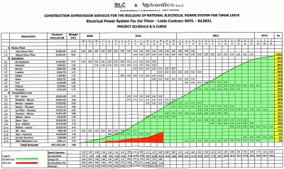 Iha mediu Dezembru, La’o Hamutuk simu relatoriu mensal ba fulan Outubru 2010 husi Electroconsult/Bonifica. Relatoriu ne’e inklui grafika “kurva-s” iha liman karuk hodi hatudu projeitu nia statutu, ne’ebe ita bele klik atu bele hetan ho boot no atualizadu. Area matak ne’e hatudu servisu hira mak halao tiha ona atu tuir orariu projeitu nian, kor mean ne’e indika servisu ne’ebe atualmente halao ona. Puri Akraya Engineering seidauk hahu servisu ba sentral eletrisidade nian, no hein atu hetan pagamentu uluk, maibe CNI22 halo servisu oituan liu. Durante fulan Outubru, tore 11 mak hari tiha ona, hodi aumenta tore sai ba 41 (1.7%). Iha numeru ida hanesan ne’e, sei presiza to tinan 2027 atu finalize rede distribuisaun nasional. Negosiasaun ho subkontratu Indonezia sira atu hari parte linha transmisaun lao dadauk hela, sein iha kontratu ne’ebe asina. EB reporta katak sira sei “halo presaun ne’ebe konstanta ba CNI22 atu halo lalais akordu ho subkontraktor husi Indonezia ba linha transmisaun no subkontrator Timor-oan atu halao substasaun sira, maibe rezultadu ne’e sei nafatin hanesan deit: promesa iha promesa nia leten, Kontrator nia hahalok nakar nafatin iha.” EB mos preokupa kona-ba “kualidade servisu ne’ebe fraku liu” espesialmente bainhira sira la mai iha fatin servisu. Aleinde atu ezije CNI22 atu la'o lalais liu, EB nota katak “Kontrator hetan KUIDADO dala ida tan katak uza no hala'o material, trasportasaun, tula, hatun, rai sasan, kontinua LA ASEITAVEL, iha estragus barak mak akontese husi ida ne’e.” Maske, Governu halao ona pagamentu tuir orariu, maske nune'e kustu kontratu ba projeitu nian boot liu ba montante ne’ebe hateten ba Parlamentu ka osan ne’ebe iha dotasaun. Tuir mai iha total kustu ne’ebe Governu sei selu ba CNI22 no nia subkontrator sira kada tinan ida, iha dolar Amerika, atu hari sentral eletrisidade no rede nasional ho voltazem as. | | At the end of October, CNI22 employed 435 Chinese and 397 Timorese workers on the project, and EB's report includes their job titles. There was no significant change to the poor environmental performance that month. According to ELC/Bonifica's November 2010 report, 156 more Chinese workers (mostly "skilled workers" for transmission lines) had arrived (totaling 591), but the number of Timorese working on the transmission lines had dropped by 44, and at the end of November CNI22 was only employing 353 Timorese workers. The November report includes a revised section on environmental compliance, which shows little improvement but, for the first time, reports on poor sanitary and housing conditions for workers building the substations around the country. The January 2011 report still shows 591 Chinese workers, but Timorese workers had declined further, to 331. No work was done on the Hera or Betano generating stations during November. Eighteen new towers were erected for the power grid, a very slight improvement over the previous month, and workers began stringing wires on the Hera-Dili segment. Some construction work was done at the Dili and Manatuto substations, with initial site preparation at a few others. Negotiations with other Indonesian subcontractors for parts of the grid were still in process, with no contracts yet signed. Six weeks after the contract was signed with Puri Akraya Engineering (PAE), the Indonesian company was still waiting to receive its initial advance payment, and had not started work, although they were organizing a "Kick Off Meeting". ELC/Bonifica's November report says that PAE will give "top priority" to the Hera power plant, "with target of three generating sets to be operative by November 2011 and other four generating sets to be operative by March 2012." Work on the Betano power plant "will start during 2011, the target is to complete the installation of the eight generating sets within end of 2012 first half of 2013." However, PAE's project schedule (click on image above) shows that three months for "Testing and Commissioning" will not begin until 16 months after the project starts -- that is, until April 2012 -- this schedule must be accelerated if the target is to be met.