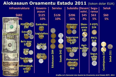 | 2011 State Budget The proposed State Budget for 2011 allocated $166 million for this project for 2011 alone, comprising more than half a new Infrastructure Fund which will be difficult to oversee and can be carried over between years or moved between projects without Parliamentary approval. However, this is much less than the $380 million Timor-Leste is committed to pay for this project during 2011. See the table above for how its budgetary allocations and contractual commitments have changed over the years. La'o Hamutuk asked the National Parliament not to "approve more money for the Heavy Oil project and national electric grid until the Government has provided accurate, comprehensive information about the project’s many problems, and until adequate consideration has been given to renewable sources of energy for Timor-Leste’s people." We pointed out that "Timor-Leste spent nearly $100 million for this project in 2008-2010, and the total cost will be more than $600 million. The original promise to provide 24/7 electricity to all district capitals by the end of 2009 is long forgotten; it is clear that the current promise to complete the entire project by the end of 2011 will not be met." In a follow-up letter, we explained the contradiction between the $166 million allocated for this project in the 2011 budget and its contractual obligations. | Orsamentu Jeral Estado 2011 Proposta Orsamentu Jeral Estado 2011 aloka tokon $166 ba projeitu ida ne'e ba tinan 2011 deit, liu metade Fundu Infraestrutura ne’ebe sei difikulta atu tau matan no implemetan durante tinan barak ka muda ba projeitu seluk sein aprovasaun Parlamentar. Maske nune’e, montante ne’e menus liu montante tokon $380 ne’ebe Timor-Leste iha komitmentu atu selu ba projeitu ida ne’e durante 2011. Hare tabele iha leten atu hatene alokasaun orsamental no komitmentu kontraktual ne’ebe hetan mudansa durante tinan hirak ne’e. La'o Hamutuk husu ba Parliamentu Nasional atu "La bele aprova orsamentu tan iha oin mai ba projeitu Oleu Pezadu no Linha Transmisaun, too Governu fo informasaun ne’ebe los no komprehensivu kona-ba projeitu ne’e nia problema sira, no too iha konsiderasaun adekuadu ba fontes enerzia renovavel ba povo Timor-Leste.” Ami hato’o katak “Timor-Leste gasta ona besik tokon $100 ba projeitu ida ne’e iha 2008-2010," no total kustu sei liu tan tokon $600. "Ema barak haluha ona promesa Primeiru Ministru ba Parlamentu katak projeitu ida ne’e sei fo eletrisidade 24 oras ba kapital distritu tomak iha fin de 2009, no sei for servisu ba trabalhadores Timor-oan 20,000 durante konstrusaun. Ne’e klaru katak promesa dadaun atu kompleta projeitu ne’e iha fin de 2011 sei la bele akontese mos.” Iha karta esplikasaun tan ba Komisaun C, ami esplika kontradisaun entre tokon $166 ne’ebe aloka ba projeitu ne’e iha orsamentu 2011 no projeitu ne’e nia obrigasaun kontraktual nian. | On 27 January 2011, during the plenary debate on the 2011 State Budget, Parliament increased the electricity project allocation by $282 million (to a total of $447 million in 2011). The following day, the Deputies increased the authorized withdrawal from the Petroleum Fund for this year to $1,055 million, a $321 million increase in excess of the Estimated Sustainable Income. Three-quarters of the $599 allocated to the new Infrastructure Fund for 2011 will pay for this one project.