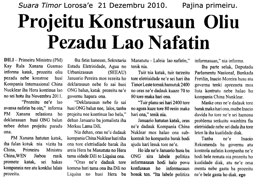 Infelizmente, resposta husi ofisiais publiku sira ne’e la hetan atensaun. Sekertariu Estadu ba Eletrisidade Januariu Pereira ne’ebe kuota husi Timor Post iha Dezembru defende “direitu CNI22 atu fo subkontrata” maibe la mensiona katak asaun ida ne’e halao tamba hetan presaun husi Governu Timor-Leste, ho kustu adisional tokon $250. Loron tuir,artigu ida iha pajina oin Suara Timor Lorosa’e (klik imazem iha liman los) kuota Primeiru Ministru ne’ebe hateten katak CNI22 nia servisu iha Hera kontinua no sei finaliza iha Novembru 2011, hanesan Primeiru Ministru Xineza nian promete ba nia iha fulan ida antes. Iha artigu ne’ebe hanesan Sr. Pereira akuza ONG sira fo “informasaun bosok ten” no husu ba sira atu labele politiza informasaun sira no halo konfuzaun ba publiku nia hateten katak tore 70 ka 80 husi tores 2400 hari tiha ona.