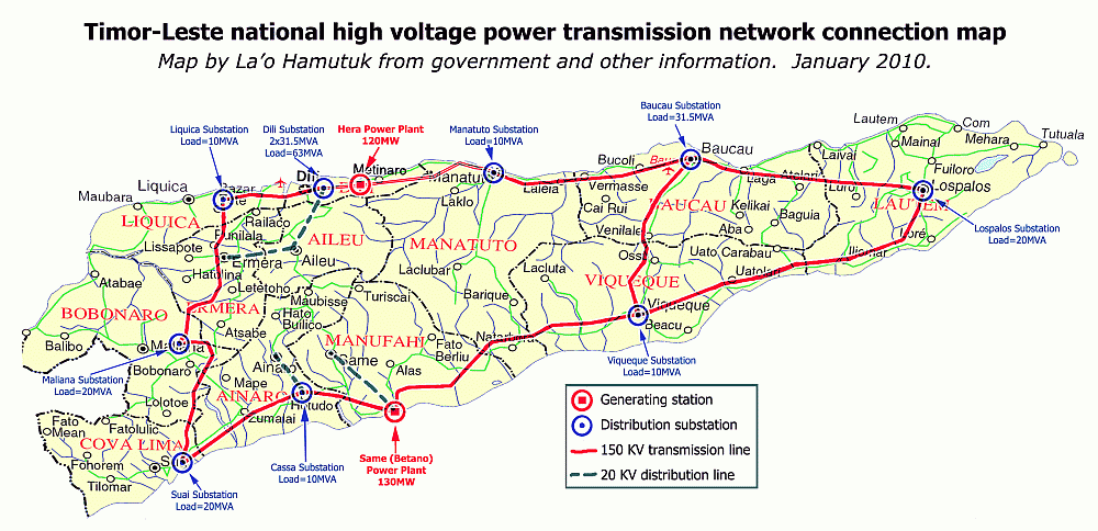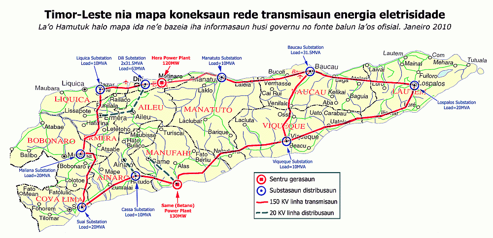 | Due to the large amount of information about this near-billion-dollar, multi-year project, La'o Hamutuk has created several web pages with information about different time periods. Follow these links to the page you want: Summary Since early 2008, Timor-Leste's government has been discussing and implementing an electric power system costing almost $400 million, based on used generators from China which will burn heavy oil. Prime Minister Gusmão promised to have electricity in every district by the end of 2009, based on a contract signed in October 2008 with Chinese Nuclear Industry Construction Company No. 22 (CNI22). Throughout 2009, the project encountered growing criticism of its expense, design, environmental impacts, procurement procedures and legal processes. Work at the Hera generation site was suspended in August, with a major redesign undertaken. In November 2009, major "corrections" to the design were announced, and the cornerstone for the Hera site was laid on 15 January 2010. Late in 2010, the Government realized that CNI22 was incapable of implementing the project, and the Hera and Betano power stations were re-contracted to the new Indonesian company Puri Akraya Engineering, which was to import engine/generator sets from the Finnish company Wartsila. The price of the generators doubled, and Parliament added $321 million to the 2011 State Budget to cover part of the costs. During 2011, construction proceeded in earnest, as more information came out about the poor environmental, construction, labor, planning and implementation of the project. As the Prime Minister's 28 November deadline to electrify the north coast neared, the public began to pay more attention to the project which was consuming nearly half of all state expenditures. Unfortunately, a series of revelations, accidents, cost overruns, mismanagement and other events cause much skepticism and polemics. The Hera plant went into operation in late 2011, and the Betano plant the following year. The project continues to be costly to fuel and operate, requiring significant maintenance expenditures, and, as of 2017, about one-forth of Timorese households remain unconnected to the grid. Click here for the most recent information. | Tamba iha informasaun barak kona-ba projeitu tinan barak ne’ebe gasta osan besik dolar biliaun ida, La’o Hamutuk kria tiha pajina web balun ho informasaun kona-ba period de tempu ne’ebe lahanesan. Tuir ligasaun ida ne’e ba pajina ne’ebe ita-boot hakarak: Rezumu Desde iha inisiu 2008, Governu Timor-Leste diskute no implementa ona sistema eletrika ida ho kustu besik tokon $400, bazeia ba jerador uzadu husi Xina nebe sei uza oleu pezadu. Primeiru Ministru Gusmão promete atu iha eletrisidade ba distritu tomak iha fin de 2009, bazeia ba kontratu ne'ebe asina iha Outubru 2008 ho Kompanha Konstrusaun Industria Nuklear No. 22 (CNI22). Iha 2009 nia laran, projeitu neé hamoris kritika kona ba nia gastus, desenho, impaktu ambiental, prosedementu aprovisionamento nian no prosesu legal nian. Servisu iha sentral eletrika Hera suspende tiha iha Augustu 2009, hodi halo fali alterasaun bo’ot ba denzenho. Iha Novembru 2009, “koreksaun” bo’ot ba dezenho ne’e anunsia sai, no lansamento primeira pedra ba sentral Hera halao iha 15 Janeiru 2010. Iha fin de 2010, Governu realiza katak CNI22 laiha kapasidade atu implementa projeitu ne’e, no kontratu ba sentral eletrika Hera no Betano entrega ba Puri Akraya Engineering, ne’ebe atu hatama jeradores husi kompania Finlandia, Wartsila. Presu jeradores sira ne’e sai dupla tiha, no Parlamentu aumenta tokon $321 ba Orsamentu Estadu 2011 atu kobre parte husi kustu balun. Durante 2011, prosesu konstrusaun lao duni, no iha informasaun barak mak sai kona-ba asuntu ambiental, konstrusaun, trabalhadores, planu no implementasaun projeitu ne’ebe fraku. Bainhira Primeiru Ministru hateten katak loron 28 Novembru nudar loron hahu ba eletrifikasaun kosta norte, publiku hahu fo atensaun barak ba projeitu ne’ebe gasta osan besik metade husi gastu estadu nian tomak. Infelizmente, iha revelasoens, asidente, kustu ne’ebe sae ba beibeik, mal-jestaun no eventu sira seluk hamosu duvida no polemika barak. |