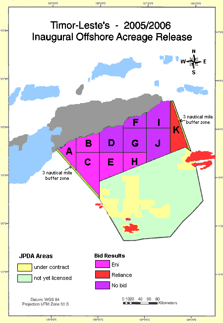 In early 2006, Timor-Leste offered eleven blocks for companies to bid, according to this procedure, with this bidding envelope form. On 20 April 2006, RDTL announced that five companies had submitted bids for six of the eleven blocks (pink on map above) offered. The companies are ENI S.P.A (Italy), Reliance Industries Limited (India), and a consortium led by Petronas Carigati (Malaysia) which includes Petróleo Brasileiro (Petrobras, Brazil) and GALP Exploração e Produção Petrolífera (Portugal). A commission evaluated the bids, and on 12 May recommended that contracts be awarded to Eni for areas A, B, C, E and H, and to Reliance for area K. On 16 June, the RDTL Government released the Evaluation Report explaining how the decisions were made. On 3 November 2006, the government announced that it had signed PSCs for five contract areas with Eni, and released the texts, accessible from here. Several media articles about the signing are below: On 19 December 2006, the RDTL Petroleum Ministry granted permission for Eni to invite companies to bid for seismic exploration without a full public tender process. During the same period, the Timor Sea Designated Authority (TSDA) conducted a bidding round for unlicensed areas of the Joint Development Area (green on map above). Follow this link for more information about the TSDA round. During 2008, Timor-Leste began discussing a licensing round to be held during 2009 or 2010. Timor-Leste prepares for licensing roundRick Wilkinson, Oil and Gas Journal, Feb. 8, 2005 MELBOURNE -- The government of Timor-Leste is finalizing details for a new petroleum fiscal regime this month before an onshore and offshore licensing round scheduled during April and June. The regime will be based on a production-sharing contract system benchmarked against similar arrangements in other countries within Southeast Asia to ensure it will be competitive. At the same time, Timor-Leste's Energy and Minerals Directorate is preparing a geological and geophysical data package covering areas to be licensed in what will be the country's first offer of exploration rights in 3 decades. Late last year, a joint venture of China's PetroChina and Norway's Global Geo Services ASA received a contract to acquire about 6,400 km of 2D seismic data in offshore areas to the south of Timor that are clearly not in dispute with Australia. The data will be available for purchase by companies that wish to participate in the new licensing round. Only one offshore well has been drilled in the region—Mola-1 about 3 km off the south coast. It found noncommercial gas in Pliocene-age reservoirs in 1975. Permits will also be offered in the country's onshore region, particularly the southern half where numerous oil and gas seeps have been well documented since the early 1900s. There has been no onshore drilling in the country since the Indonesian annexation of East Timor in 1975. Prior to that, 22 wells were drilled by Timor Oil Ltd., Sydney, during 1957-74. Numerous oil and gas shows were noted during this program, and two wells, Matai-1 and Cota Taci-1, both on the southwest coast near the border with West Timor, flowed at 160 b/d and 200 b/d, respectively. This was not enough to sustain commercial production. Timor-Leste also is planning to establish a national oil company modeled on the Brazilian state oil firm Petroleo Brasileiro SA to participate in upstream and downstream operations and a National Petroleum Fund to manage its potential oil and gas revenues. Officials from the Energy and Minerals Directorate plan visits to Asia, Europe, and the US to make presentations on the licensing round. by Rowan Callick, Australian Financial Review, February 7, 2005 Timor on Track to Establish Oil, Gas IndustryFrom Rigzone.com FWN Select Tuesday, February 08, 2005