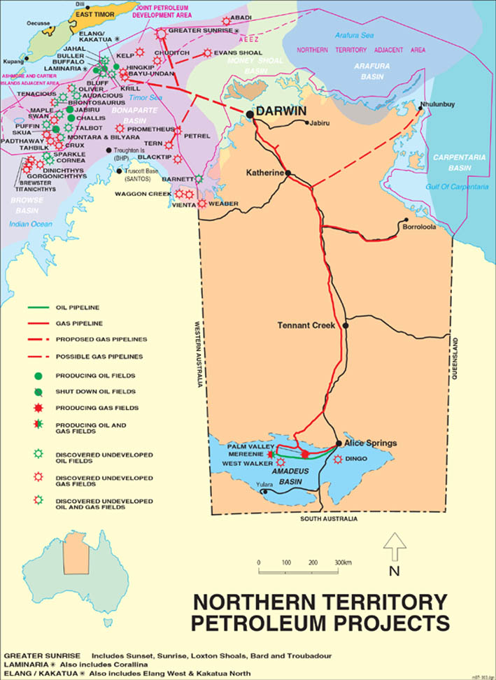 Map of Australia's worldwide maritime territory claim Timor Sea Oil and Gas Factsheets from the Northern Territory government, August 2003. Also in PDF: Timor Sea, Bayu-Undan, Greater Sunrise , Buffalo Oilfield , Petrel/Tern , Elang/Kakatua , Evans Shoal