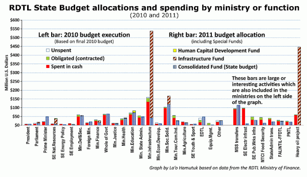 Understanding the 2011 State Budget 25 February 2011 A version of this article was published in Tempo Semanal, in Tetum. Liga ba pajina ida ne'e iha lingua Tetum. During the last few weeks, Timor-Leste’s politicians and journalists have vigorously debated the 2011 State Budget, as the Government was authorized to spend $1.3 billion dollars this year, twice as much as they received in the original 2010 budget. La’o Hamutuk believes that it easy to get confused by the big numbers and the partisan politics, and we have prepared two graphs (click on them to see them larger) which we hope will help readers understand what the budget actually contains. These graphs include information about the budget execution of each Ministry during 2010, although we believe that spending money is not the main function of government. It would be easy for a Minister to steal or lose his entire budget and achieve 100% execution – but the people who require the services his or her Ministry is supposed to provide would be in serious trouble. However, budget numbers don’t contain information about the actual work done by state agencies and whether that work satisfied people’s needs and wishes – people can see that with their own eyes.