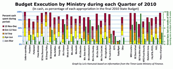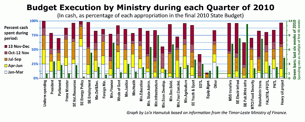 Graph #1 shows the amount of money allocated to the functions of each Ministry in the final 2010 and 2011 budgets, in millions of U.S. dollars. The categories on the left part of the graph are each Ministry or organ. The right part of the graph shows some large or interesting sub-categories, including public transfers from MSS, major components of the Defense & Security and Infrastructure budgets, food security (rice imports), PDD, and the heavy oil electricity project. The heavy oil and infrastructure bars are so large that the other categories look small, but they each spent more than $5 million. Each category contains two bars: the left hand one is 2010 and the right-hand one is 2011. The colors in the left bar show the execution of the 2010 budget. The red part is how much money was actually spent (totaling $688 million), the green is obligations (the work associated with this has not been done or paid for, $106 million), and the white ($54 million) is money that was appropriated but not used. The right bar shows the 2011 budget, and the colors show which part of the budget the money comes from. The vertically striped blue part is the $682 million Consolidated Fund, the normal state budget. The other two parts are the new Special Funds: brown diagonal stripes represent the $599 million Infrastructure Fund and yellow is the $25 million Human Capital Development Fund. The Special Funds are not managed by individual ministries (and although the Minister of Finance can shift their allocations from one year or project to another), but at present they are allocated to projects which fall within the competence of particular ministries. We have drawn them with each ministry to show how the 2011 budget is allocated by function. The largest allocations from the Infrastructure Fund are $447m for the national electricity project (shown with the Ministry of Infrastructure), $45m for the “MDG-suco” program to build local community housing (shown with MSS), $19m for studies related to the Tasi Mane project (shown with SERN), and $8m for the FreeBalance software program (shown with the Ministry of Finance). This graph shows how public money was spent last year and how it will be spent this year, and illustrates where public resources will go. It is clear that investment in human and local productive capital – education, health and agriculture, gets much less money than physical infrastructure and subsidies. Graph #2 shows when each ministry or function spent its money during 2010, as a percentage of their total budget appropriation. Each bar represents the total amount spent during the year; if they had spent the entire allocation shown in Graph 1, it would be 100%. The white lowest bar shows spending during the first trimester (January to March), the yellow bar during the next three, and the speckled orange bar during the third trimester. Since a lot of money is spent at the end of the year, we have divided the last trimester in half: The diagonally striped part is from 1 October to 12 November, and the solid dark red is from 15 November through the end of 2010. The green line to the right of each bar shows (on the right-hand scale of 1-12) how many times faster each agency spent money during the last six weeks of 2010 than they did during the rest of the year. An uneven rate of spending could represent irregular program needs, bad planning, poor implementation or possible corruption. This graph is based on data from the Ministry of Finance. We find it hard to believe that some ministries could spend the people’s money during Independence Day and Christmas more than five times faster than they did between January and mid-November, but we leave it to others to decide if the outcomes are good, the numbers are wrong, or the money was wasted.