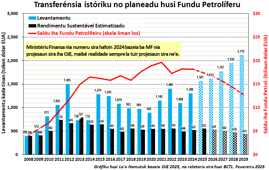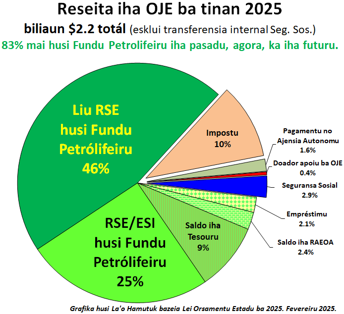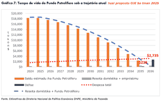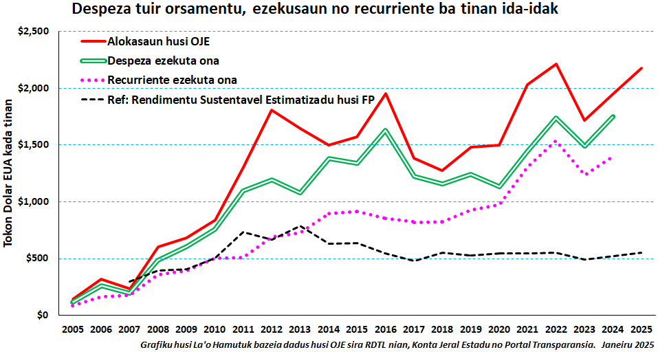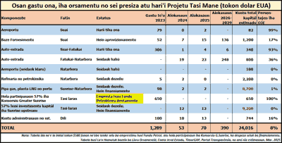 Ministériu Finansas aprezenta senáriu rua ne’ebé sei hamamuk Fundu Petrolíferu molok tinan 2036. OGE final sempre boot liu senáriu sira aprezenta uluk. Órgaun sira sei prepara sira nia proposta orsamentál ba 2025, no Komité Revisaun Politiku sei diskute iha 12-21 Agostu, no remata ninia servisu iha loron 27 Agostu. Hafoin aprovasaun husi Konsellu Ministrus, Governu se aprezenta proposta OGE 2025, ba Parlamentu Nasional. Durante fulan Jullu, média lokál balu halo entrevista ho La'o Hamutuk kona-ba OGE 2025, inklui Independente TV, TVET, Tatoli no RTM TV. Iha loron 17 Jullu, Konsellu Ministrus aprova montante totál despeza nian biliaun $1.8, maske karik montante ne'e sei aumenta durante prosesu orsamentál. Tetus dezagregadus sei distribui ba entidades públikas iha loron 23 Jullu, no sira iha loron 11 hodi elabora sira-nia proposta no haruka ba Komité Revizaun Orsamentál. Ministériu Finansas fahe Sirkulár Preparasaun OJE 2025 iha loron 23 Jullu. Loron ida tuir mai, Konsellu Ministrus aprova kompozisaun ba Komité Revizaun Polítiku. Iha loron 30 Setembru, Konsellu Ministrus aprova OJE 2025 ho montante biliaun $2.2, 20% liu fali totál ne'ebé sira estabelese fulan rua antes. Proposta OJE ida ne'e haruka ba Parlamentu Nasional loron ida tuir mai. |