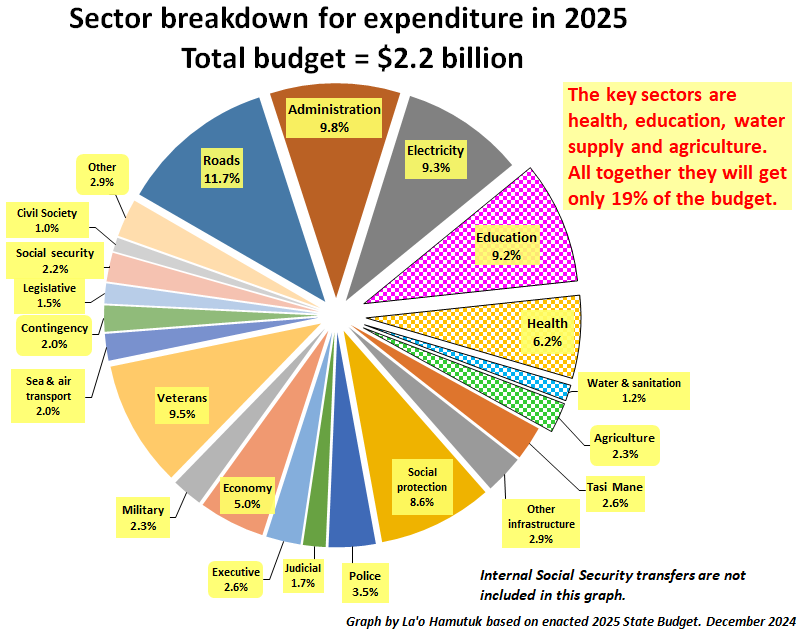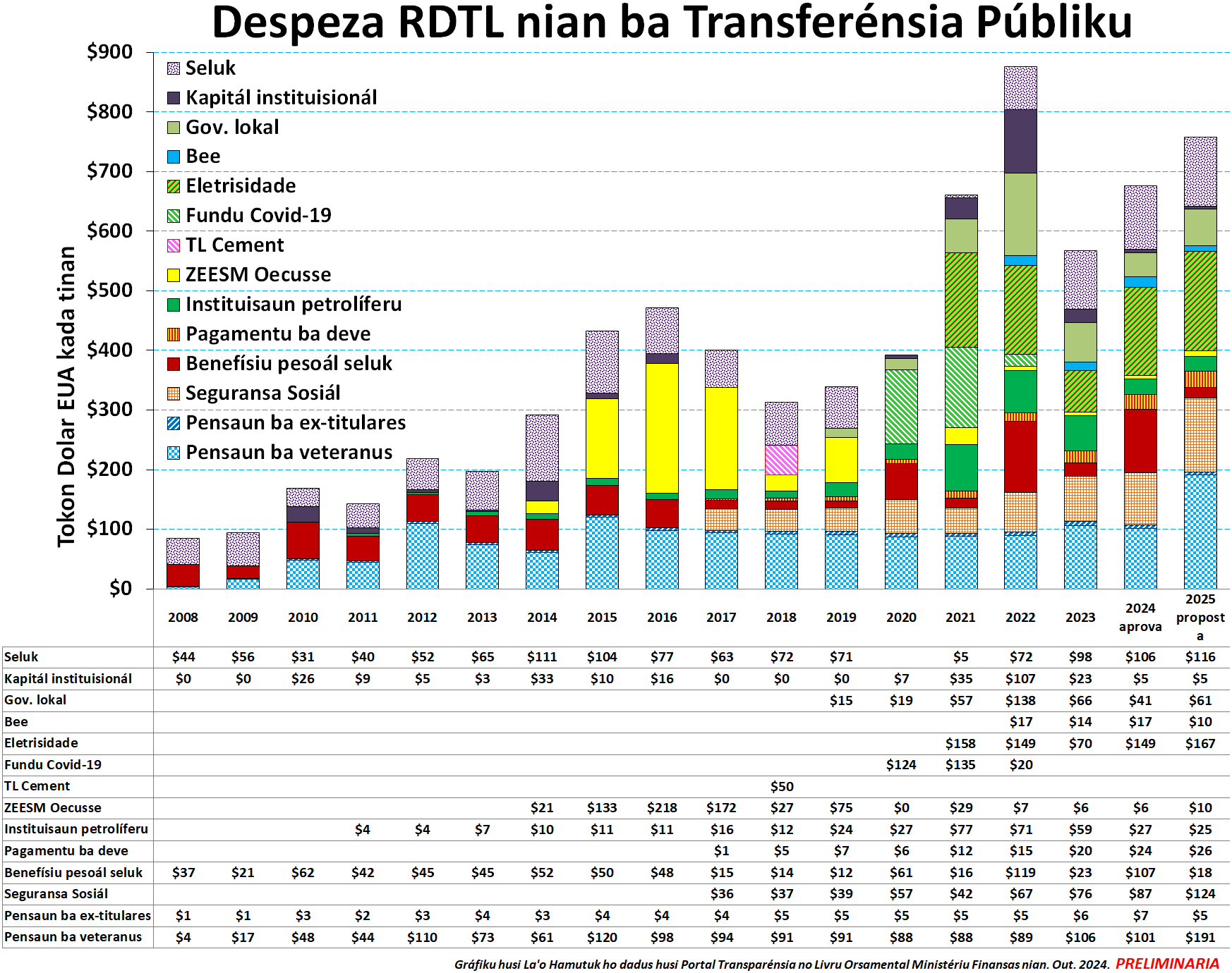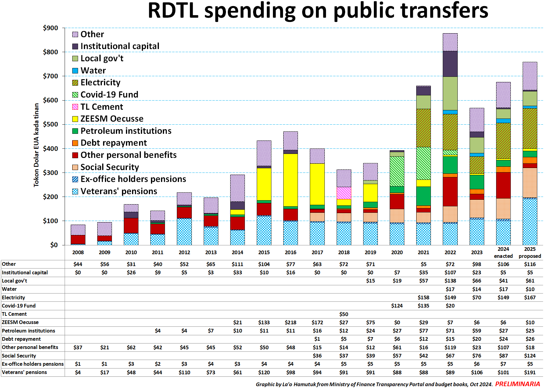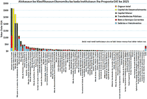 Discussion in National Parliament Parliament distributed the budget proposal to its standing committees, which is holding hearings on 21-25 October (calendar, initial schedule of hearings by Committees C&D) and report back before the plenary debate begins on 6 November. They intend to send the enacted budget to President of the Republic on 27 November. On 16-17 October, Parliament held an Overview Seminar in Liquica (agenda, summary, audio recording) with presentations from the Ministry of Finance, Central Bank, UNDP, La'o Hamutuk and others. La'o Hamutuk researchers were guests on TV talk shows on GMN Grande Entrevista, Independente, RTM and Tatoli discussing the proposed 2025 budget. La'o Hamutuk distributed a submission (Tetum) to Parliament on 25 October. On 29 October, we issued a press release and held a press conference, which was widely covered. Parliament Committee C attached our submission to their report. Parliament approved rules for plenary discussion and voting on the budget. Parliament Committee D (Economy and Development) and C (Public Finances) submitted their reports, and plenary debate began on 6 November, with speeches by Prime Minister Xanana Gusmão, Fretilin, PLP and others. Fretilin also made a closing intervention in the general debate. On 8 November, Parliament approved the proposed budget in generality with 42 votes in favor, none against, and 22 abstentions (by Fretilin). Parliament has created a web folder with key budget documents, including a summary and text of 73 proposed amendments. Discussion and voting began on 11 November and will continue until 25 November. Nearly all (67) of the amendments were proposed by Fretilin. In the first day of debate on specifics, 14 proposed amendments to reduce appropriations for the National Parliament and the President of the Republic were voted down along party lines. On 20 November, Parliament approved the budget with 42 votes in favor, 23 against (Fretilin and PLP), and no abstentions. The total amount is unchanged from the proposal, although the sole amendment which passed reduced expenditure for g7+ by $1 million, reallocating it to F-FDTL and the Ministry of Education. Parliament delivered the approved budget to President José Ramos-Horta on 25 November, and La'o Hamutuk wrote to him asking him to veto it and send it back to Parliament. A few hours later, he promulgated the state budget law for 2025 as Law no. 8/2024. |