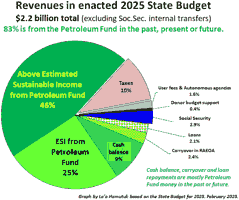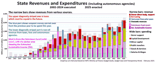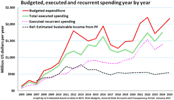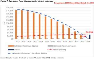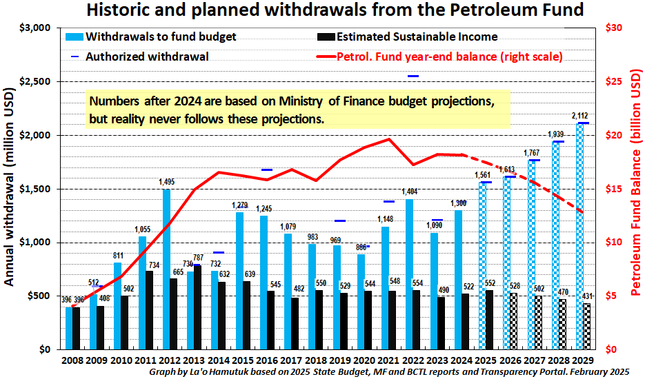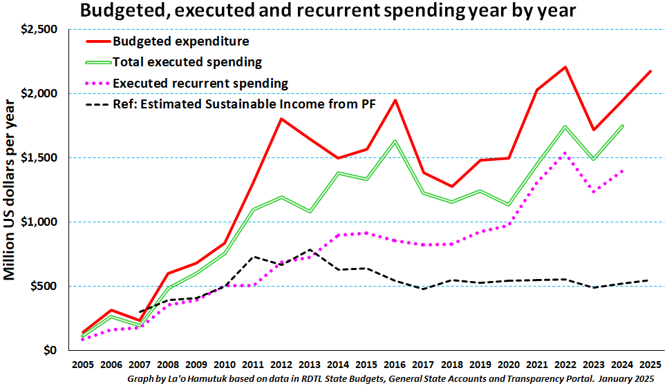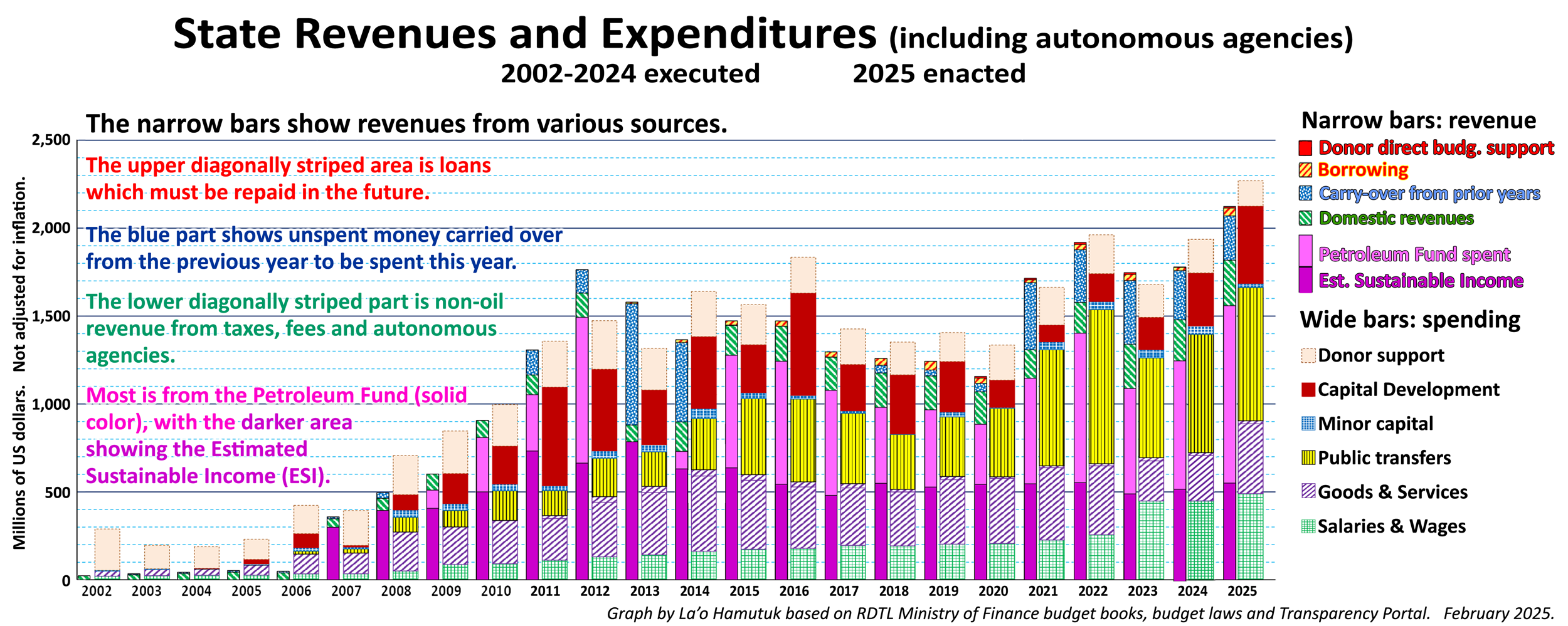 Two scenarios were presented, both of which will empty the Petroleum Fund by 2036. In recent years, the enacted budget has always become larger than scenarios presented before the Government finalized its budget proposal. Ministries and agencies will prepare their budget proposals for 2025, and the Political Review Committee will discuss them during 12-21 August and finish its work on the proposed budget by 27 August. Following approval by the Council of Ministers, Government will then submit the proposal to the National Parliament by 1 October. In early July, local media interviewed La'o Hamutuk about the budget several times, including Independente TV, TVET, Tatoli and RTM TV. On 17 July, the Council of Ministers set a budget ceiling of $1.8 billion. Each entity will be given a ceiling on 23 July, and will have 11 days to prepare its proposal to the Budget Review Committee. The Ministry of Finance distributed the budget circular on 23 July. The next day, the Council of Ministers approved the composition of the Political Review Committee. On 30 September, the Council of Ministers approved a $2.2 billion budget for 2025, 20% higher than the ceiling they had set two months earlier. It was submitted to Parliament the following day. |