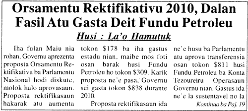 Orsamentu Rektifikativu 2010, Dalan Fasil atu Gasta Deit Fundu Petroleu Husi La’o Hamutuk Publika ona iha Timor Post (pajina primeiru) no Tempo Semanal 19 Junu 2010 Liga ba pajina web La'o Hamutuk nian kona-ba Orsamentu Rektifikativu 2010, ho dokumentu no komentariu ruma. Liga ba sumisaun ba Parlamentu Nasional husi La'o Hamutuk kona-ba Orsamentu Rektifikativu 2010
