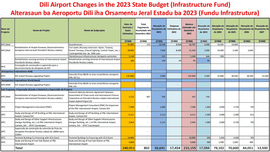 Airport planning resumes in 2020 Six years later, the ADB and the Government resumed work on the airport project, appointing an Interministerial Working Group. The runway will not go across the Comoro River, and an access road will enable people to get to aldeia Beto Tasi. Nevertheless, 75 households (almost 600 people) will be displaced, and 36 households more will be directly impacted. Environmental and social information is on La'o Hamutuk's web page on environmental documents. The 2021 State Budget includes only part of the construction costs, which are estimated to total $483 million (including a $44 million grant from Japan and $100 million to be borrowed from the ADB). According to Budget Book 1 (pages 63-64), construction will begin in 2022 and be completed by 2024 or 2025.