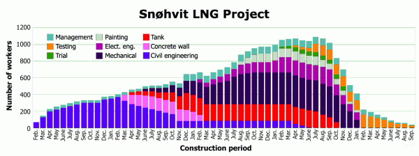 The construction of an LNG plant takes three to six years. At the peak, more than one thousand workers may be needed, but many for less than a year. The Snøhvit LNG project in Norway, constructed between 2002 and 2007, employed around 1,800 during the peak period of construction (see Figure 16). The Wickham Point LNG project in Darwin, which liquefies natural gas from the Bayu-Undan field in the JPDA, projected a peak of near 1,200 jobs for a single five million tons per annum (mtpa) liquefaction train, and near 1,600 for staggered construction of two 5-mtpa trains (over a three-year period for each train; see Figure 17 and [66]). The expansion of Atlantic LNG in Trinidad and Tobago, which involved adding a new 5.2-mtpa liquefaction train, storage tank, and jetty to the existing capacity of 9.6 mtpa, was reported in December 2005 to have logged more than 14 million worker-hours, with the storage tank still to be built. At 2,000 hours/year, this corresponds to 7,000 worker-years; the workforce peaked at 3,500. [10] Trinidad and Tobago has more workers than the other two examples; this may be partly caused by contractors’ economizing on labor in countries with high labor costs, as well as the higher productivity of labor in developed countries reducing the amount of manpower needed for a given task. Therefore, the construction of an LNG facility in Timor-Leste could tend towards the higher end of the range. As these cases illustrate, the construction of an LNG facility employs a large number of people for a short period of time. This presents an opportunity as well as a challenge. Even short-term work would be welcome by many Timorese, yet it is not certain how many of the construction jobs would go to Timorese workers. Many of these are high-skilled jobs that require extensive training, and the short period of construction does not allow time to learn high-skilled jobs. This includes not only engineering and management positions, but also skill-intensive manual work like specialized welding. Furthermore, no Timorese company would be able to supply manpower at this scale, whereas the world’s large construction companies are used to bringing in thousands of foreign workers to construction sites for short periods. For these reasons, the contractors for the construction job may find it easier to build a construction camp to house the workers they need, whom they would bring in from countries like the Philippines. To increase the number of Timorese employees, the contractors should be required to recruit locally and to prepare skilled Timorese workers before construction starts. If plant construction doesn’t begin until it is needed to replace Bayu-Undan gas (about 2015, see Chapter 9.1 and Figure 25), this would allow more time for future workers to receive training and on-the-job experience, especially if the RDTL Government and oil companies work together. We make recommendations for how to prepare for this challenge in Chapter 9. Even with the best preparation, however, the bulk of the work will be done by people from abroad. In Darwin, where the skill levels are relatively high, only 25% of the construction workforce was projected to be obtained locally. [66] Similarly, at Snøhvit, from the total construction work, only about 800 worker-years would be sourced locally. The number of operating personnel is much lower than the number of workers needed for construction. Gas liquefaction is an extremely capital-intensive activity—very little labor is involved in the process once construction is completed. So during normal operations, the LNG facility will not employ many people, about 40 permanent personnel per mtpa capacity.