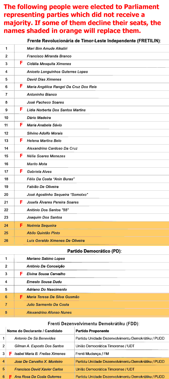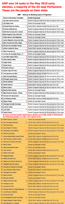 | Iha-ne’e ita bele haree lista sé-sé mak hetan eleitu husi AMP, no mós husi partidu tolu seluk, bazeia ba lista kandidatura sira ne’ebé partidu sira aprezenta ba CNE.