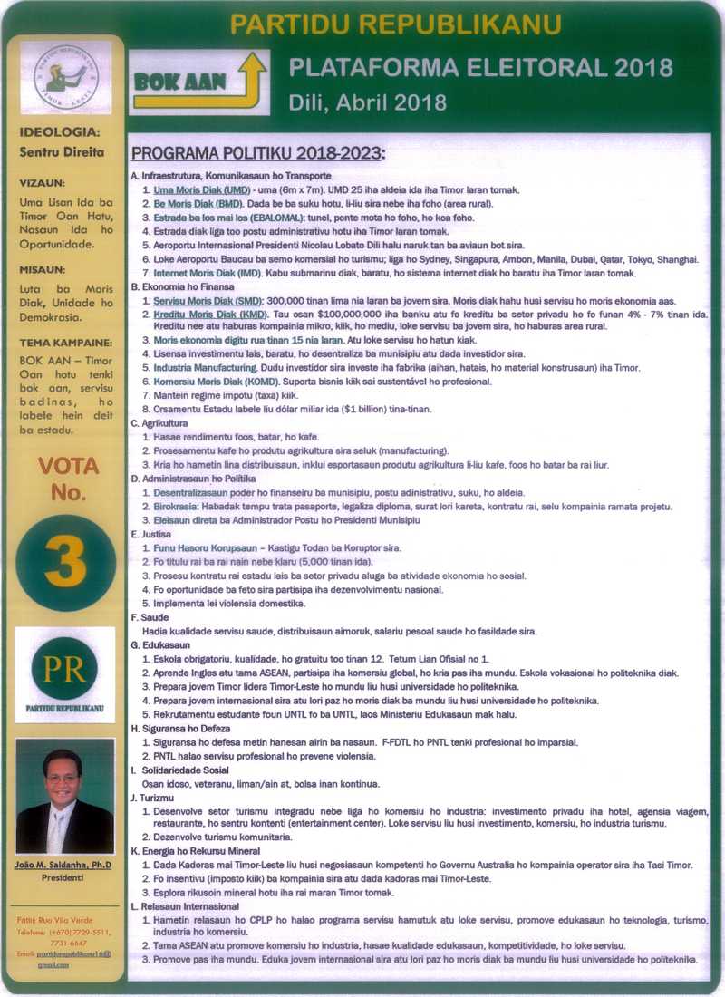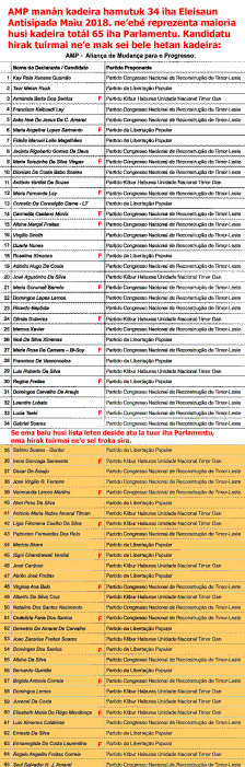 After negotiation with the other political parties, FRETILIN was only able to secure 30 votes through its coalition with PD, and the two parties formed a minority government. CNRT, PLP and KHUNTO formed a majority opposition, becoming the Alliance for Change and Progress (Aliansa Mudansa ba Progresu - AMP) to participate in early Parliamentary elections. According to RDTL Constitution articles 108 and 109, the Government submits its program to National Parliament for consideration, debate and approval. The Program of the VII Constitutional Government did not pass Parliament, and the Government did not present it for a second time before the President of the Republic decided to call for early elections after hearing from political parties, civil society and religious leaders. A few days later, he set the date for 12 May. | Introdusaun no antesedente Iha loron 07 Fevreiru 2018 Prezidente da Repúblika Francisco Guterres Lú-Olo determina loron ba Eleisaun Parlamentár Antesipada ne’ebé sei halo iha loron 12 fulan Maiu 2018. Desizaun Prezidente nian ne’e mai nu’udar rezultadu hosi impase polítiku ne’ebé akontese tanba hafoin Governu VII ne’ebé hetan apoiu husi deputadu sira minoria 30 kadeira, Governu ne’ebé lidera hosi Primeiru Ministru Dr. Mari Alkatiri nia programa la pasa iha Parlamentu Nasional. Molok ne’e iha eleisaun parlamentár iha 2017, FRETILIN manán ho votu 29.7%, CNRT ho votu 29.5%, PLP ho votu 10.6%, PD ho votu 9.8% no KHUNTO ho votu 6.4%. Total kadeira sira iha Parlamentu Nasional fahe tuir votu sira ne’ebé partidu lima ne’e hetan mak FRETILIN ho kadeira 23, CNRT ho kadeira 22, PLP ho kadeira 8, PD ho kadeira 7 no KHUNTO ho kadeira 5. Hafoin rezultadu ida ne’e, FRETILIN hanesan partidu ho votu barak liu, hetan direitu atu forma Governu no presiza asegura kadeira menus liu 33 atu nune’e bele hetan maioria Parlamentár. Infelizmente, hafoin halo negosiasaun ho partidu polítiku ho votu sira, FRETILIN konsege asegura de’it kadeira 30 liu hosi koligasaun ho PD. Ho nune’e FRETILIN no PD konsege forma de’it Governu ida ne’ebé hetan apoiu minoria iha Parlamentu Nasional. CNRT, PLP no KHUNTO forma opozisaun maioria parlamentár ne’ebé ikus mai hamutuk forma Aliansa Mudansa ba Progresu (AMP) atu hakat ba Eleisaun Parlamentár Antesipada nian. Tuir Konstituisaun RDTL artigu 108 no 109, Governu halo no hato’o nia programa ba Parlamentu Nasional atu hetan apresiasaun, diskute no aprova. Programa VII Governu nia la pasa iha Parlamentu Nasional, Governu la aprezenta fali nia programa ba darua too Prezidente Repúblika deside eleisaun antesipada hafoin rona tiha partidu polítiku sira, sosiedade sivíl no lider relijiozu sira. | | Process for early elections After the President decided on early elections, the Technical Secretariat for Election Administration (STAE) and National Elections Commission (CNE) began to organize them for 12 May, and STAE published a registration tabulation on 17 January (updated in April), and a calendar of the electoral process on 21 February. The Court of Appeals began receiving registrations from political parties and coalitions which were interested to compete. On 28 March, the Court of Appeals issued the list of parties and coalitions who had passed the process and would be on the ballet. These parties drew numbers for ballot positions, which were allocated as follows: | Prosesu Eleisaun Antesipada Hafoin Prezidente Repúblika deside eleisaun antesipada, órgaun eleitorál sira hahú organiza prosesu sira ne’ebé sei lori Timor-Leste tama ba iha eleisaun Antesipada, tuir data ne’ebé Prezidente da Repúblika determina ona, no Sekretáriadu Tékniku Administrasaun Eleisaun (STAE) publika Resenseamentu provizóriu iha loron 17 Janeiru (sei atualiza) no Calendário das Operações Eleitorais iha loron 21 Fevreiru. Tribunal de Rekursu hahú hosi data simu rejistu ba partidu polítiku ka koligasaun sira ne’ebé iha interese atu kompete ba iha Eleisaun Antesipada. Iha loron 28 Marsu 2018 Tribunal de Rekursu fó sai lista ba partidu polítiku no koligasaun sira ne’ebé mak liu prosesu no atu konkore iha eleisaun antesipada. Partidu no Koligasaun sira tuir númeru sorteiu ne’ebé aloka ona mak hanesan tuir mai ne’e: | Partido Esperança da Pátria (PEP) Partido Democrático (PD); Kompromisiu Eleitoral Partidu Republikanu (PR); Programa Politiku Partido Frente Revolucionária de Timor-Leste Independente (FRETILIN); Programa Governasaun Movimento Social Democrata (MSD) - Partidu Sosialista Timor (PST), Centro Ação Social Democrata Timorense (CASDT), Partido Social Democrata (PSD) no Partido Democracia Cristão (PDC) Movimentu Desenvolvimentu Nacional (MDN) - Unidade Nacional Democrática da Resistencia Timorense (UNDERTIM), Movimento Libertasaun Povo Maubere (MLPM), Associacao Popular Monarquia Timorense (APMT), Partido Liberta Povo Aileba (PLPA) Frenti Dezevolvimentu Demokrátiku (FDD) - Partido Unidade Dezenvolvimentu Demokrátiku (PUDD), União Democrática Timorense (UDT), Frenti Mudança; Plataforma politika, resposta ba LH nia kestionáriu Aliança Mudança para o Progresso (AMP) - Partido Congresso Nacional de Reconstrução de Timor-Leste (CNRT), Partido da Libertação Popular (PLP) no Klibur Haburas Unidade Nacional Timor Oan (KHUNTO); Programa AMP