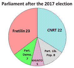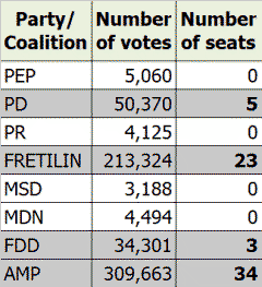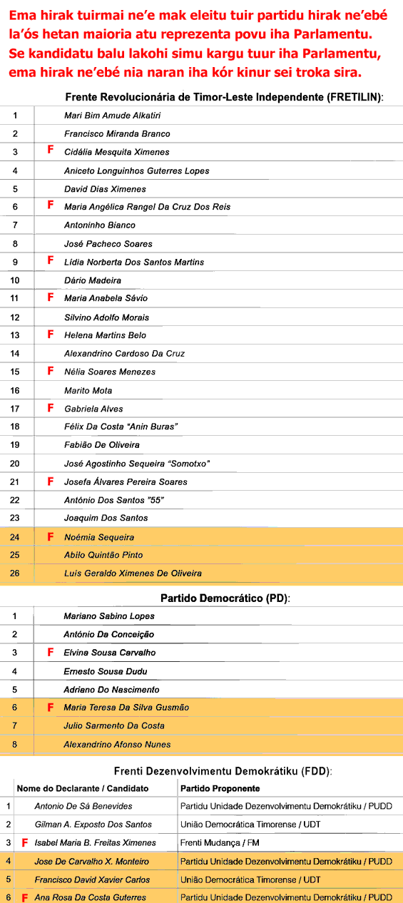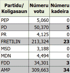 | TVE, hamutuk ho La'o Hamutuk no Core Group on Transparency (CGT), fo sai debate balu iha televiziaun ho partidu sira kona-ba asuntu oi-oin. Bele hare balun liu 'streaming' iha Facebook: TVE sei organiza debate sia tan -- hare orariu iha liman karuk. | ResultsTimorese voters cast 635,116 valid votes on a very peaceful and democratic election day. This table shows the complete, official results of the election. Although Fretilin appealed the result to the Court of Appeals, in the end they accepted the court's rejection of their petition. PEP, PR, MSD and MDN all did not receive enough votes to be allocated any seats in parliament. AMP will get 34 seats, which gives them an absolute majority in Parliament. However, Fretilin will be still be a strong opposition with 1/3rd of seats on their own. According to Article 88.3 of the Constitution, Fretilin’s 23 seats are enough to prevent overriding a presidential veto on major legislation, which could help to prevent consolidation of power. | Rezultadu Timoroan sira hato’o votu válidu totál 635,116 iha eleisaun ne’ebé la’o ho dame no demokrátiku iha loron votasaun. Informasaun iha tabela ne’e mak rezultadu kompletu no ofisiál. Maske Fretilin halo rekursu ba Tribunal Rekursu kona-ba rezultadu, ikus liu sira simu rezultadu hafoin Tribunal rejeita sira nia petisaun. PEP, PR, MSD no MDN sira hotu la hetan votu nato’on atu hetan kadeira iha parlamentu. AMP sei hetan kadeira 34, ne’ebé fó ba sira maioria absoluta. Maibé Fretilin sei nafatin opozisaun ne’ebé forte ho 1/3 kadeira ne’ebé sira hetan. Bazeia ba Konstituisaun artigu 88.3. Kadeira 23 husi Fretilin nato’on atu asegura Prezidente nia veto kona ba lei importante ruma, ne’ebé sei ajuda hodi prevene podér ne’ebé konsólidu. | Here you can see a list of who was elected from AMP, and from the other three parties, based on the candidate lists parties presented to CNE.