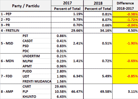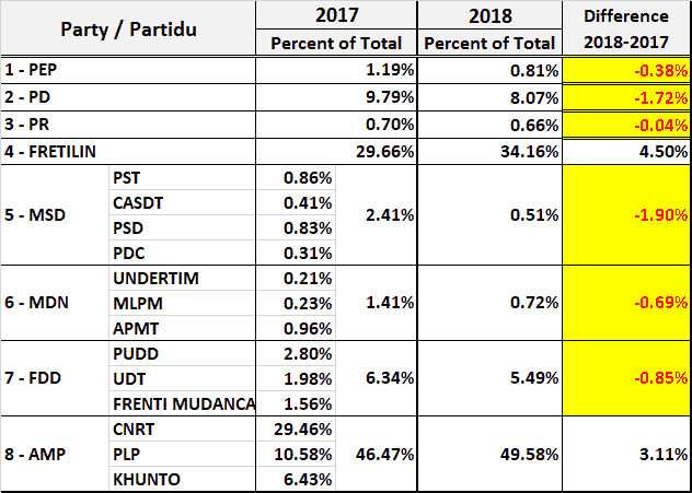 Video ne’e husi CNE/STAE uza métodu hanesan ne’e. Iha Timor-Leste, partidu ka koligasaun ne’ebé simu menus 4% husi totál votu válidu la hetan kadeira ida iha Parlamentu. Iha partidu ka koligasaun 4 ne’ebé la pasa bareira (4%) nudár kritéria mínimu entaun sira la hetan kadeira ida. La’o Hamutuk hakerek esplikasaun kle'an liu tan kona-ba métodu d’Hondt, ne’ebé ita boot bele download iha ne’e. Ami mós halo video badak ne’ebé ita bele hare streaming ka download (15 MB). | | Comparison with 2017 The chart below shows the changes in the percentage of votes received by each party (including the 4 parties who received less than the 4% threshold to be eligible for a seat in parliament). Fretilin has the largest percentage increase of votes, but AMP received the largest increase in absolute number of votes (Fretilin received 44,844 more votes and AMP received 45,673). The percentage vote for every other party dropped slightly. | Komparasaun ho 2017 Tabela iha okos hatudu mudansa persentajen de votu ne’ebé kada partidu sira hetan (inklui mós partidu polítiku 4 ne’ebé labele liu bareira 4% nudár kritéria mínimu hodi hetan kadeira iha parlamentu). Fretilin hetan persentajen aumenta votu ne’ebé aas liu, maibé AMP hetan númeru votu ne’ebé aas liu (Fretilin simu tan votu 44,844 no AMP simu tan votu 45,673). Partidu sira seluk hetan persentajen votus menus ho númeru ki’ik. |  | | More voters turned out for the 2018 Parliamentary elections than either the 2017 Parliamentary elections or 2017 Presidential elections. In the 2017 Presidential and Parliamentary elections, 71.2% and 76.7% of registered voters turned out to vote respectively. In the 2018 Parliamentary elections 81% of registered voters turned out to vote. This trend was reflected in overseas voting as well, which was four times higher in 2018 than 2017. This is a promising trend, because it shows that Timorese people are more engaged in the political process, making it more democratic and representative. Another significant change is the 5% increase in the number of valid votes, due to fewer blank and null ballots. There are a few factors that La’o Hamutuk believes may have influenced this result. Firstly, all parties campaigned harder during the 2018 election season than they did in 2017. Additionally, nearly 10 months of a government with limited budget and powers, after Parliament rejected the government program, created higher stakes for the Timorese people; the conflict between political parties and eventual dissolving of Parliament created uncertainty and concerns for many. Lastly, the Council of Ministers approved Decree No. 4/2018, amending Government Decrees No. 19/2017 and 21/2017, to allow some voters, especially students, to change their place of registration from where they were originally registered. This amendment especially affects voters in Dili who often come from other municipalities and had been forced to travel far to vote in previous elections. La'o Hamutuk submitted our Election Observation Report (Tetum) to CNE and STAE. On 25 June, La'o Hamutuk wrote an open letter (Tetum) to every member of the incoming Parliament. Go here for more information about the formation and program of the new Government. | Iha númeru votante (sira ne’ebé sai duni ba vota) aas liu iha Eleisaun Parlamentár tinan 2018 kompara ho tinan 2017 nian, no mós aas liu kompara ho Eleisaun Prezidensiál 2017 nian. Iha eleisaun Parlamentár no Prezidensiál 2017, númeru eleitor sira hamutuk 76.7% no 71.2% ne’ebé rejistu fó duni sira-nia votu. Ba eleisaun parlamentár 2018 númeru 81% ne’ebé rejistu fó duni sira-nia votu. Trend ida-ne’e refleta mós iha votus husi rai li’ur, ne’ebé aumenta dala haat boot liu iha 2018 kompara ho 2017. Ida-ne’e mudansa ka trend ida-ne’ebé di’ak tanba hatudu katak ema Timoroan barak liu mak envolve iha polítika hodi halo prosesu ida-ne’e sai reprezentativu no demokrátiku liu. Mudansa seluk ne’ebé signifikante mak númeru votu válidu, ne’ebé aumenta 5% razaun ne’e tanba votus mamuk no nulu menus liu iha eleisaun ida ne’e. Iha fatór balu ne’ebé kontribui ba rezultadu ida-ne’e, tuir La’o Hamutuk nia haree. Primeiru, partidu polítiku sira hotu halo kampaña maka’as tebes durante periodu eleisaun 2018 kompara ho ida-ne’ebé sira halo iha 2017. Aleinde ne’e, besik fulan 10, governu la’o ho orsamentu no kbiit limitadu tanba Parlamentu rejeita programa governu. Situasaun ida-ne’e, konflitu entre partidu polítiku sira to’o parlamentu dissolve fó inserteza no todan ba Timoroan barak. Hafoin ida ne’e Konsellu Ministru aprova Dekretu No. 4/2018 atu halo mudansa ba Dekretu Governu No 19/2017 no 21/2017 ne’ebé fó posibilidade ba eleitor sira ruma, liuliu estudante sira, atu bele vota iha fatin ne’ebé dook husi sira nia hela fatin. Mudansa ida ne’e partikulármente eleitor sira iha Dili ne’ebé dala ruma mai husi munisipiu sira seluk lei ne’e obriga sira atu halo viajen dook no mós fó sira nia votu iha eleisaun anterior. La'o Hamutuk fahe ami nia Relatóriu Observasaun Eleisaun Antesipada Parlamentár ba CNE no STAE. Iha loron 25 Junu, LH haruka Karta aberta ba kada Deputadu/a iha Parlamentu foun. Klik iha ne'e atu hetan informasaun tan kona-ba kriasaun no programa Governu foun. | Information about the electoral process | Informasaun kona-ba prosesu eleisaun | | Commentary | Komentáriu | Relevant documents | Dokumentu relevante sira |