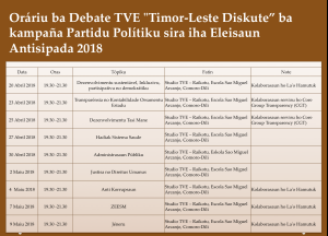 | On 2 April, STAE circulated the list of the names of candidates on each party slate. On 9 April, the parties and coalitions signed a Pact of National Unity, committing themselves to a peaceful election. The Human Rights Defenders Network encouraged them to implement that commitment. The campaign began on 10 April and will continue until 10 May, and the election will be held on 12 May. CNE published a calendar of campaign activities (8MB printed version) and put it on their website. | Iha loron 02 Abril 2018 STAE publika lista kandidatu sira hosi partidu polítiku sira no koligasaun sira. Iha loron 09 Abril 2018 partidu no koligasaun sira asina Paktu Unidade Nasional, halo kompromisu ba eleisaun pasifika. Rede Defensór Direitus Umanus ejije sira atu tuir kompromisu ida ne'e. Kampaña hahú iha loron 10 Abril 2018 to’o loron 10 Maiu 2018 no eleisaun sei hala’o iha loron 12 Maiu 2018. CNE publika kalendáriu ba atividade sira durante kampaña (verzaun imprimi 8 MB) iha sira nia website. | Information from La'o Hamutuk (all Tetum)La'o Hamutuk is distributing a questionnaire asking each party and coalition its positions on key policy issues, and we will publish the responses here as we receive them. We have also produced a brochure (right) with questions for voters to ask of campaigning politicians. Materials produced by La'o Hamutuk include: | Informasaun hosi La’o HamutukLa’o Hamutuk distribui kestionáriu ida husu pozisaun kada partidu no koligasaun sira nian kona-ba pergunta polítika xave sira no ami sei publika resposta sira bainhira ami simu. Ami mos produz broxura (liman karuk) ho pergunta ne'ebe eleitor sira bele husu ba partidu no kandidatu sira. Informasaun hosi La'o Hamutuk inklui: | TVE, with the collaboration of La'o Hamutuk and the Core Group on Transparency (CGT), is hosting a series of televised debates among the parties on different issues. You can watch Tetum streaming videos of some of them on Facebook: Nine more debates are scheduled between 20 April and 9 May -- see the schedule at right.