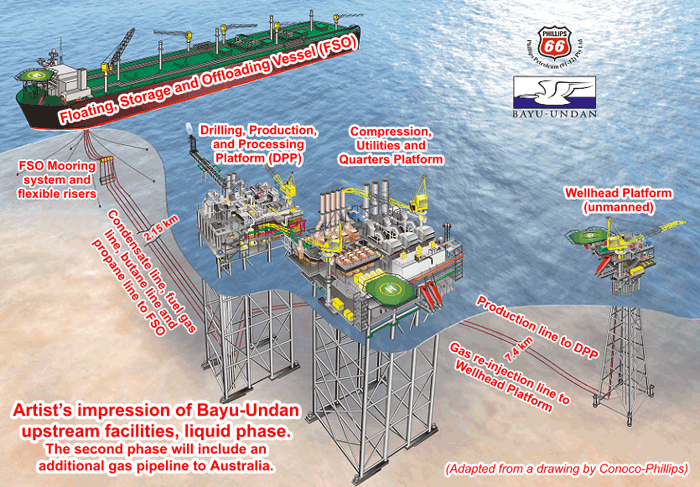 | Bayu-Undan is a large gas field within the JPDA, also operated by ConocoPhillips. This field is rich in natural gas liquids, namely liquified petroleum gas (LPG) and condensate. Bayu-Undan construction is now fully underway, following the entry into force of the Timor Sea Treaty. The liquids phase of Bayu-Undan development is expected to bring in about $1.8 billion in revenues to East Timor from when production starts in early 2004 for the next 20 years. The second phase, piping natural gas to Australia for liquification and export to Japan, will begin in April 2006, yielding $1.2 billion in revenues to East Timor over the following 17 years. Under current arrangements, East Timor will get 90% of Bayu-Undan's government share of production and taxes. | |