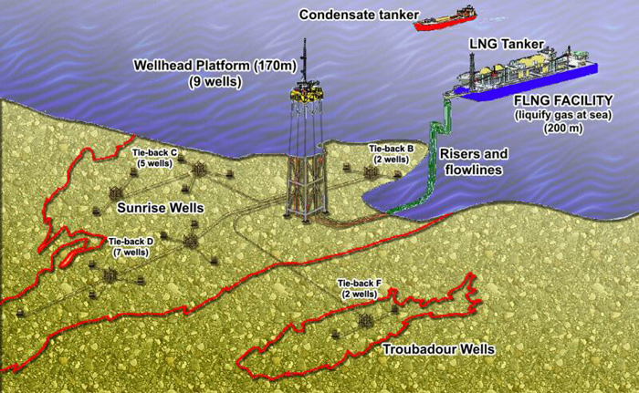 being considered for the Greater Sunrise gas field. (Adapted from drawing by Woodside Australian Energy).