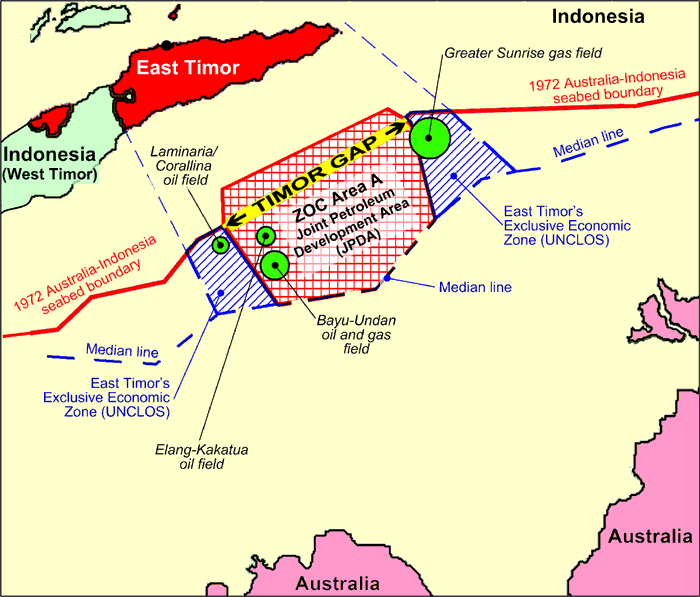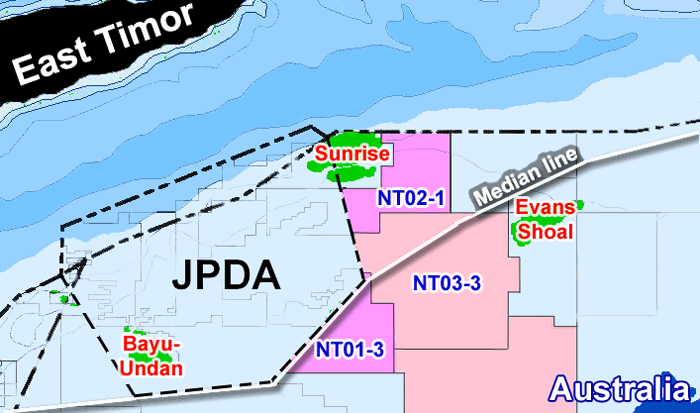 | Under the Timor Sea Treaty, East Timor gives Australia 10% of the JPDA (excluding Sunrise), or 3% of East Timor's total Timor Sea resource share. | |