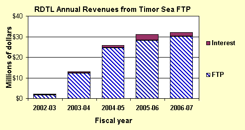 East Timor's share of money from gross sales of the oil and gas (called First Tranche Petroleum, FTP), shown on the lower graph, is not used for East Timor's annual government budget. Instead, it is invested in a capital fund. Interest earned by this fund is currently reinvested, but future interest will provide income to East Timor 30 years from now, after the oil and gas has been used up. This fund is projected to accumulate more than $100 million by the end of the 2006-7 budget year and will grow much larger after that; the graph at left indicates how much FTP and interest will be saved each year until then.