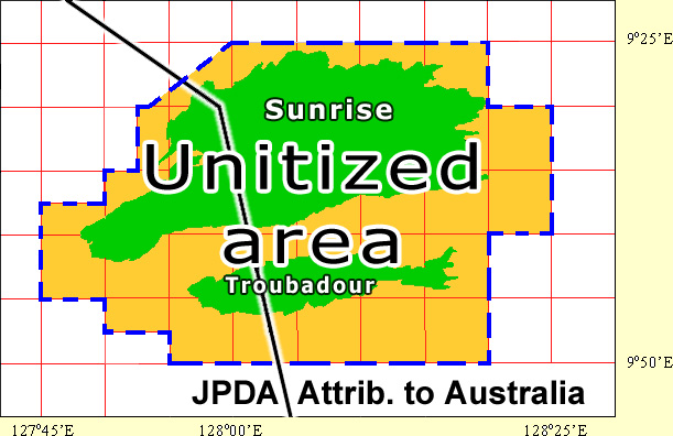 In the map, the unitized area covered by the agreement is within a dashed line, including all of the Sunrise and Troubadour fields. The bent diagonal line marks the edge of the Joint Petroleum Development Area (JPDA). Revenues from the 79.9% of the fields which are outside the JPDA (to the right on the map) are "attributed to Australia." The JPDA contains 20.1% of the fields, and since JPDA revenues are divided 90% to East Timor and 10% to Australia, Australia will receive 81.91% (79.9% + 2.01%) of the revenues from the Greater Sunrise field, with the remaining 18.09% going to East Timor. The IUA allows for adjusting the 79.9/20.1 ratio in the future, based on technical re-evaluation of how much gas lies inside and outside the JPDA.