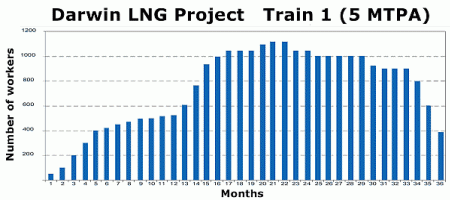 The construction of an LNG plant takes three to six years. At the peak, more than one thousand workers may be needed, but many for less than a year. The Snøhvit LNG project in Norway, constructed between 2002 and 2007, employed around 1,800 during the peak period of construction (see Figure 16). The Wickham Point LNG project in Darwin, which liquefies natural gas from the Bayu-Undan field in the JPDA, projected a peak of near 1,200 jobs for a single five million tons per annum (mtpa) liquefaction train, and near 1,600 for staggered construction of two 5-mtpa trains (over a three-year period for each train; see Figure 17 and [66]). The expansion of Atlantic LNG in Trinidad and Tobago, which involved adding a new 5.2-mtpa liquefaction train, storage tank, and jetty to the existing capacity of 9.6 mtpa, was reported in December 2005 to have logged more than 14 million worker-hours, with the storage tank still to be built. At 2,000 hours/year, this corresponds to 7,000 worker-years; the workforce peaked at 3,500. [10] Trinidad and Tobago has more workers than the other two examples; this may be partly caused by contractors’ economizing on labor in countries with high labor costs, as well as the higher productivity of labor in developed countries reducing the amount of manpower needed for a given task. Therefore, the construction of an LNG facility in Timor-Leste could tend towards the higher end of the range. As these cases illustrate, the construction of an LNG facility employs a large number of people for a short period of time. This presents an opportunity as well as a challenge. Even short-term work would be welcome by many Timorese, yet it is not certain how many of the construction jobs would go to Timorese workers. Many of these are high-skilled jobs that require extensive training, and the short period of construction does not allow time to learn high-skilled jobs. This includes not only engineering and management positions, but also skill-intensive manual work like specialized welding. Furthermore, no Timorese company would be able to supply manpower at this scale, whereas the world’s large construction companies are used to bringing in thousands of foreign workers to construction sites for short periods. For these reasons, the contractors for the construction job may find it easier to build a construction camp to house the workers they need, whom they would bring in from countries like the Philippines. To increase the number of Timorese employees, the contractors should be required to recruit locally and to prepare skilled Timorese workers before construction starts. If plant construction doesn’t begin until it is needed to replace Bayu-Undan gas (about 2015, see Chapter 9.1 and Figure 25), this would allow more time for future workers to receive training and on-the-job experience, especially if the RDTL Government and oil companies work together. We make recommendations for how to prepare for this challenge in Chapter 9. Even with the best preparation, however, the bulk of the work will be done by people from abroad. In Darwin, where the skill levels are relatively high, only 25% of the construction workforce was projected to be obtained locally. [66] Similarly, at Snøhvit, from the total construction work, only about 800 worker-years would be sourced locally. The number of operating personnel is much lower than the number of workers needed for construction. Gas liquefaction is an extremely capital-intensive activity—very little labor is involved in the process once construction is completed. So during normal operations, the LNG facility will not employ many people, about 40 permanent personnel per mtpa capacity.