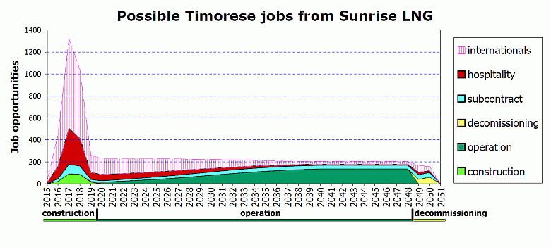 Sunrise LNG in Timor-Leste: Dreams, Realities and Challenges A Report by La’o Hamutuk February 2008 Chapter 5. Employment and Infrastructure Contents of this file5.1. Development linkages and the national infrastructure As stated above, local leaders hope and expect that many jobs will result from an LNG plant in Timor-Leste. The national government is similarly aware of the acute need for employment if living standards and economic productivity are to increase. The great majority of Timor-Leste’s citizens live from subsistence agriculture at very low productivity. Any substantive growth in per capita incomes in the non-oil part of Timor-Leste’s economy will involve people moving from subsistence agriculture into higher value-added activities, such as more productive agriculture for local or export markets, manufacturing, or public sector activities (health, education, and infrastructure). More productive forms of agriculture would be possible in combination with lower transport costs (in both money and time) to bring products to market, but in addition, growth in the non-farming private sector will likely be needed for people to move out of subsistence farming. Indeed the private non-farming sector already generates more of Timor-Leste’s Gross Domestic Product than the agricultural sector, in spite of the latter employing many times more people. [89] This means that jobs created by an LNG project could help Timor-Leste people move from agricultural work to other sectors, which the government is hoping will provide economic growth in Timor-Leste’s non-oil GDP. [88, pages 21-27] In addition to providing jobs and developing individual capacities, the construction and operation of an LNG plant can provide the impetus and start-up funding for small businesses of various kinds, as subcontractors for goods or services to the LNG project. This would develop corporate capacity as well as individual skills, and could be extremely valuable as Timor-Leste diversifies its economy in the future. What employment effects, then, ought we to expect? As Chapter 3 suggests, there are three ways in which an LNG plant might increase employment. The first is during construction, where a large number of workers are needed, but for a short amount of time. The second is during operation—that is, the workers who run and manage the plant and provide necessary support services. Finally, if there is an increase in demand for local or national goods and services—we discussed above which sectors could potentially benefit—this would translate into increased employment in those sectors. Examples include hotels, restaurants, office supply and operations, printing, security, low-skill construction, cleaning, waste disposal, road-building, and dredging. Primary effects