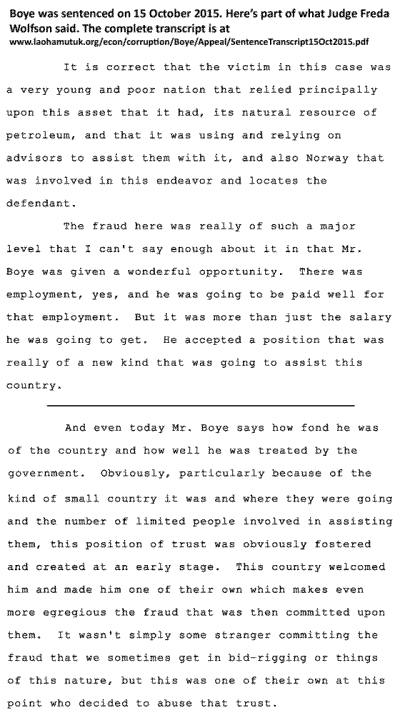On 25 November, Boye's new attorney filed a motion with the U.S. Court of Appeals for the Third District explaining that Boye intends to argue that his six-year sentence should be reduced to "as little as two months imprisonment, and possibly non-imprisonment," and asked the court to process their appeal quickly, as Boye had been ordered to report for prision 30 November. They claimed that the actual loss to Timor-Leste was much less than the $3.51 million fraud because Timor-Leste had received legal services in return for the money they paid, and that therefore a much shorter sentence was appropriate. Download key documents in this process with both sides' arguments.