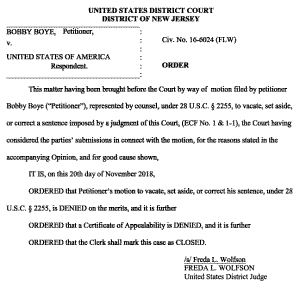 On 20 November 2018, the Court rejected Boye's petition in total, issuing a 15-page Opinion and an Order that his sentence not be vacated.